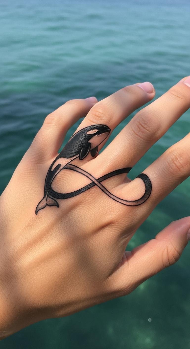 Link the orca to an infinity symbol for eternity. This combo shows lasting bonds. Draw the loop with the whale. Connect smoothly. Find infinity templates. Practice on loops. Use one color. Bold this: infinity tie in. It reflects lifelong connections. Get feedback. This makes it meaningful.