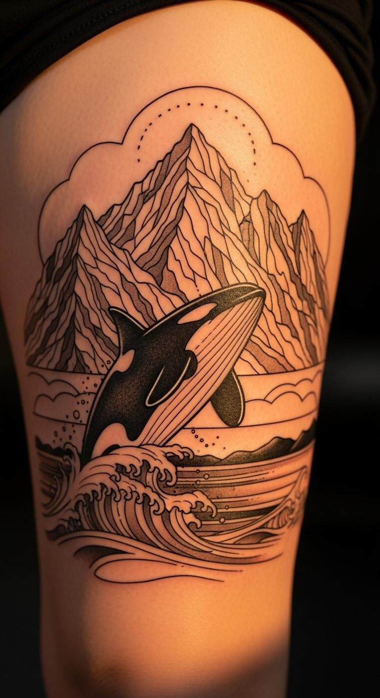Pair the orca with rugged mountains for adventure. This design links sea and land journeys. Draw a simple landscape with the whale. Include peaks and waves. Find free images to inspire you. Practice on large paper sheets. Use minimal ink for economy. Bold the suggestion: combine elements at home. It symbolizes resilience and exploration. Discuss with an artist for quick tweaks. This approach makes it personal and fun.