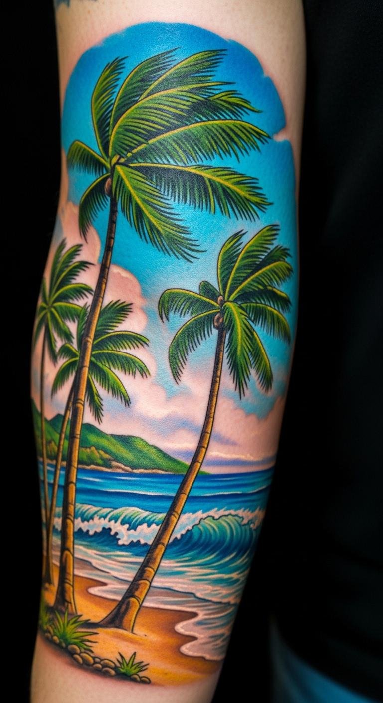 A colorful beach scene with palm trees brings the ocean to life on your skin. Picture a palm against blue waves and yellow sand. This tattoo evokes vacation vibes in bold hues. Use colored pencils to sketch ideas at home—it’s free and fun. For DIY, grab washable markers to test on your arm. Aim for spots like the forearm for easy viewing. Choose affordable inks that last; ask for artist recommendations under $200. Add elements like a tiny shell to personalize it. Keep maintenance easy with basic lotion from your cabinet. This design suits beach lovers. Practice by drawing simple scenes on paper first. Change colors based on your favorite spots, like red for sunsets, to make it yours.