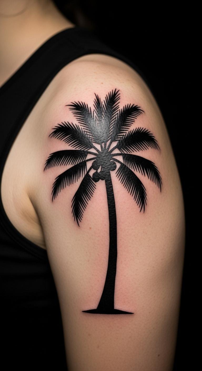 A negative space palm tree uses empty spots for a modern look. Picture the tree formed by bare skin. It’s clever and minimalist. Cut shapes from paper to practice. For DIY, use stencils on fabric. Shoulder spots work great. Fees are about $80. Keep it dry initially. This style stands out. Experiment with shapes. Test with cutouts on skin.