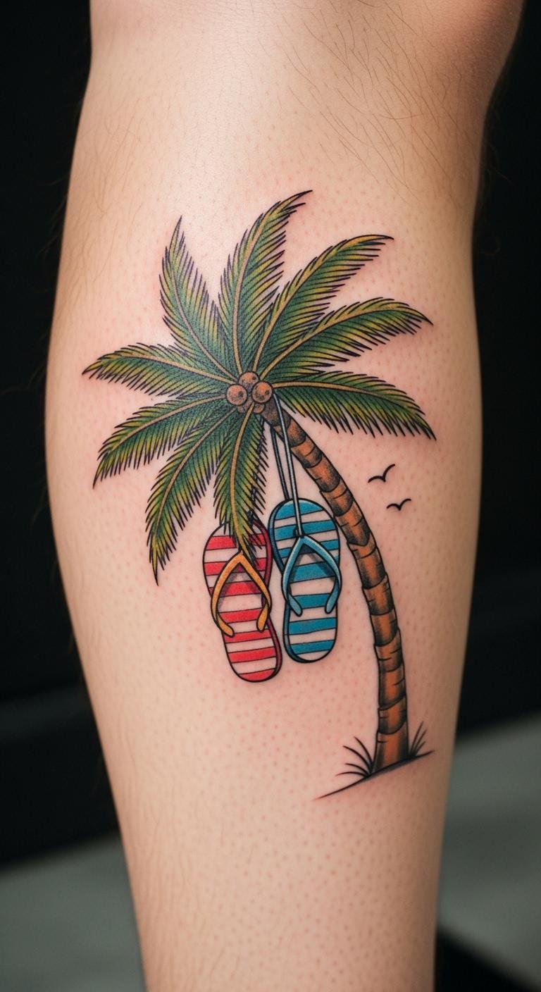 A palm tree with flip-flops tattoo adds fun beach gear. See the tree next to sandals on your calf. It’s playful and summery. Draw with crayons for ideas. Use temporary decals for trials. Calf areas are straightforward. Artists charge $70. Protect with socks. This one evokes holidays. Mix in colors you like. Practice on paper shoes.