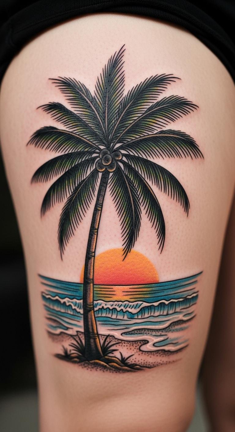 A beach motif palm tree includes sand and sea for a full vibe. Imagine it on your thigh with extras. It’s immersive and thematic. Paint scenes on canvas at home. For testing, use beach-themed stickers. Thigh spots heal well. Costs around $120. Use sunblock for protection. This design transports you. Customize with local elements. Try fabric versions first.