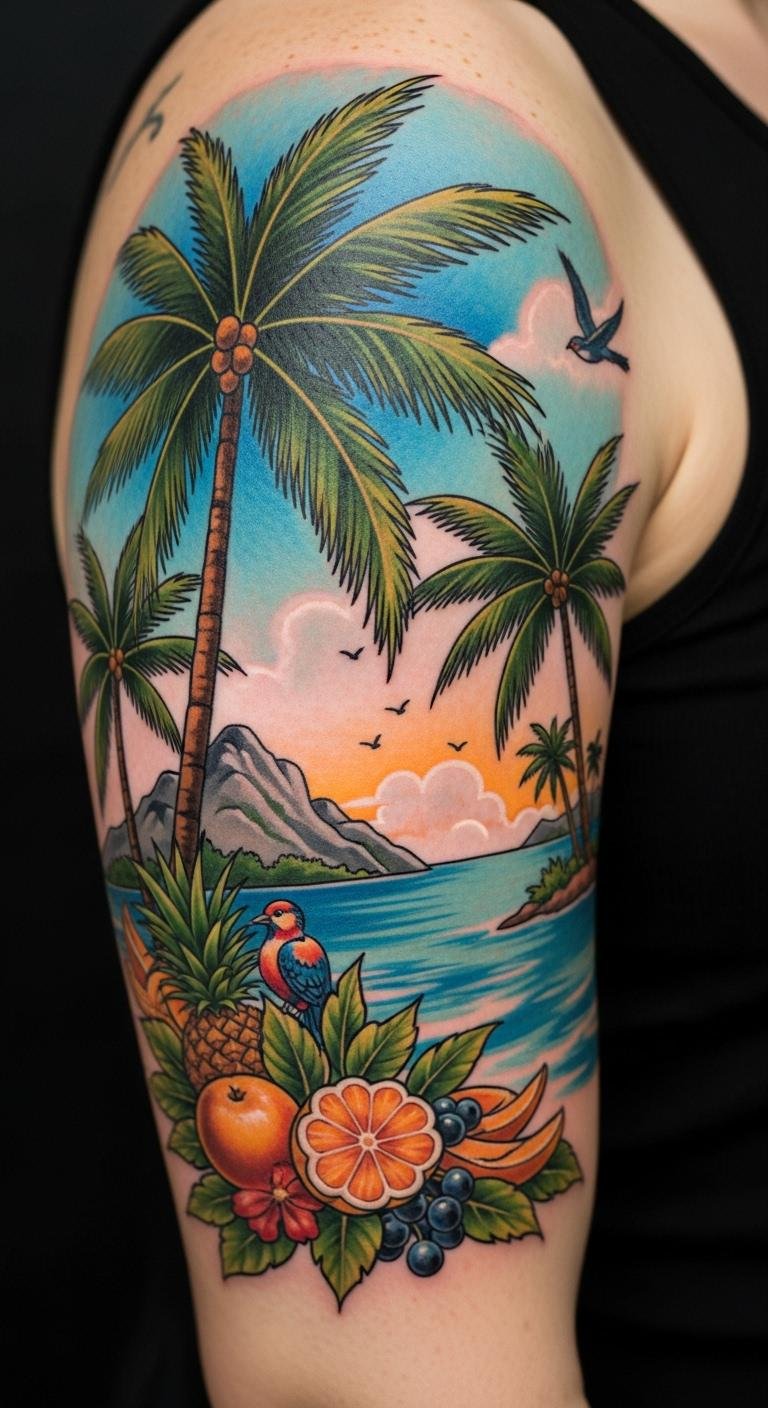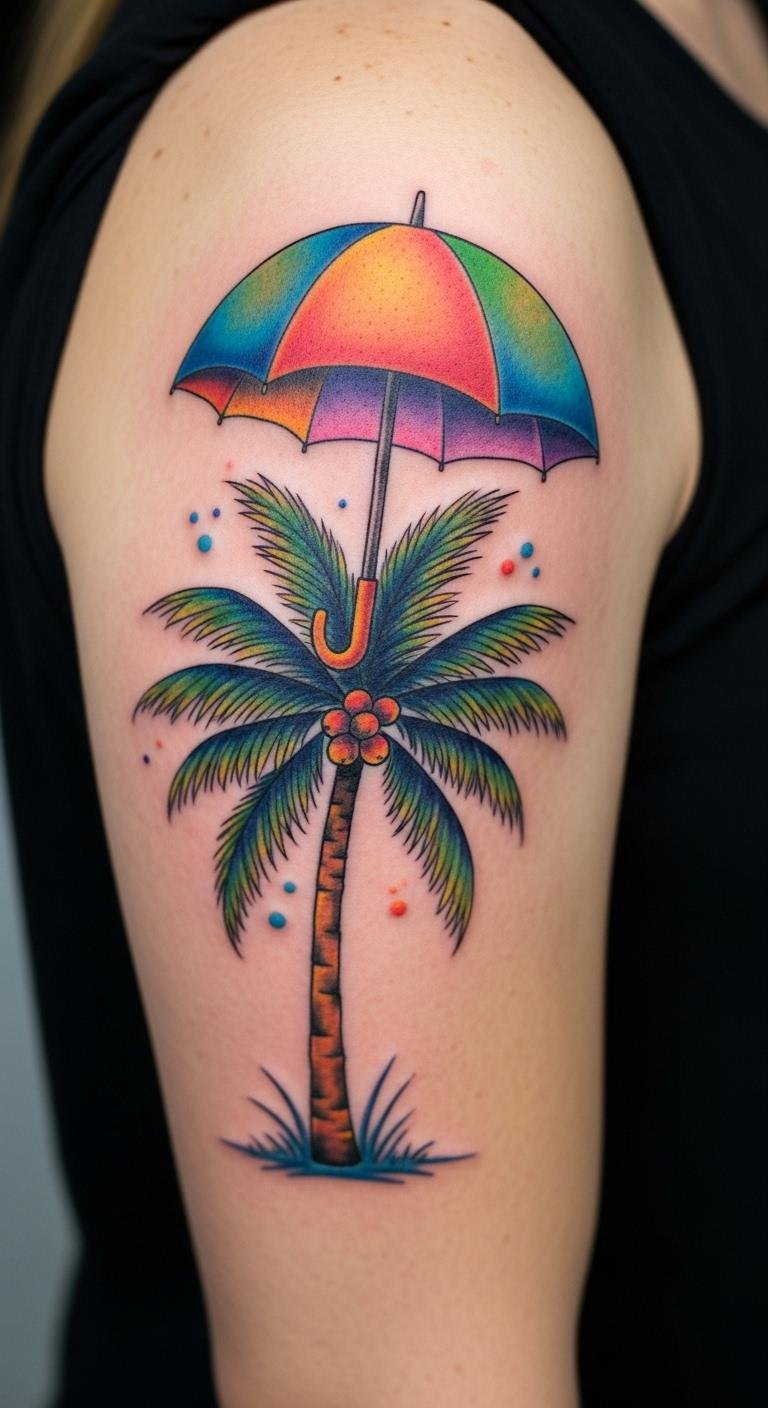A colorful palm tree with umbrella adds shade to the scene. See it on your upper arm with pops of color. It’s whimsical and fun. Draw with colored pens. For DIY, use umbrella stickers. Arm spots are visible. Artists charge $90. Protect from wear. This design pops. Include your shade preferences. Try temporary options.