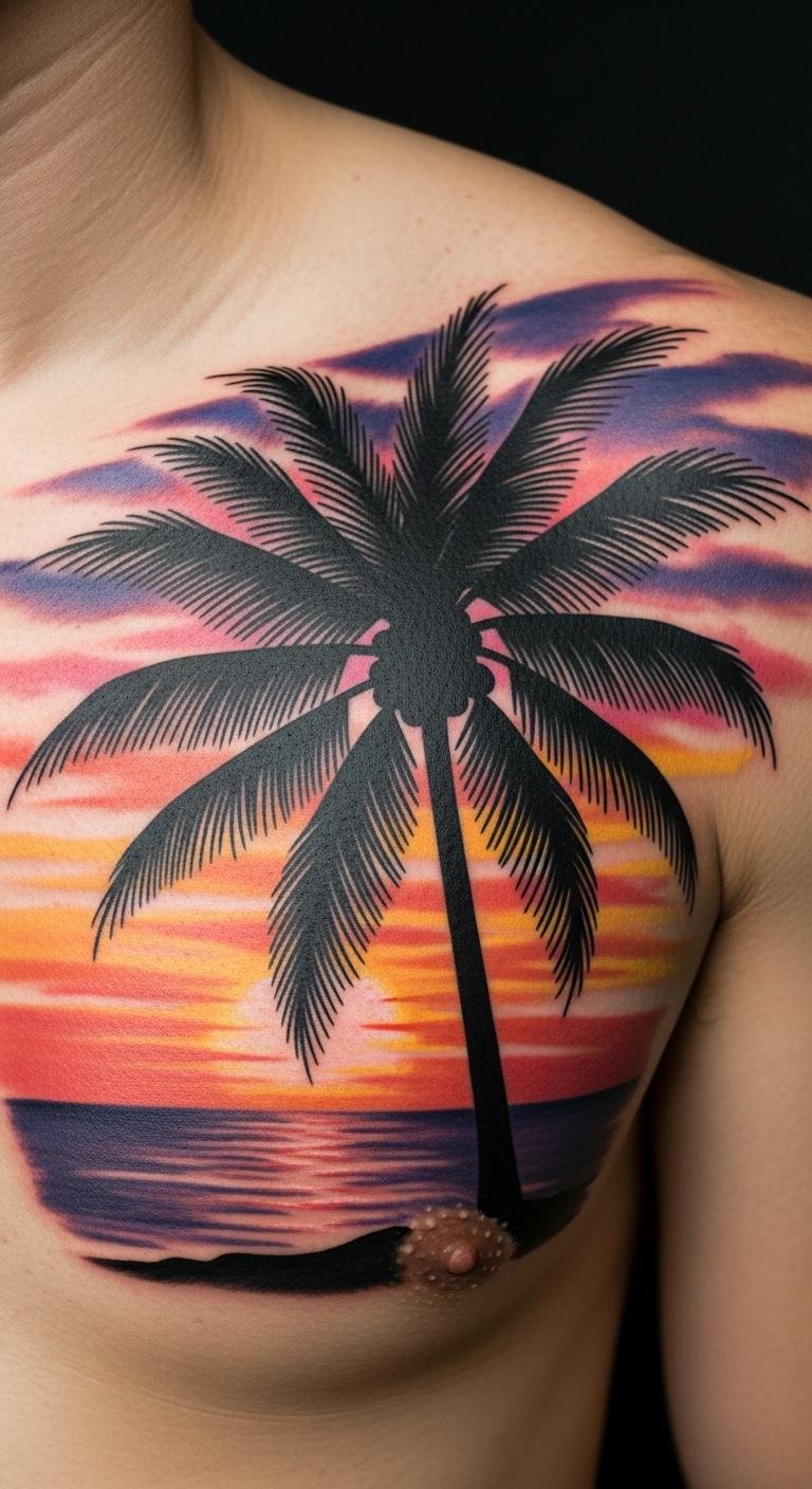 A palm tree and sunset combo merges day and night. Picture it on your chest with color blends. It’s poetic and striking. Blend paints for practice. For trials, use sunset filters on photos. Chest spots need care. Fees are about $150. Use gentle washes. This design inspires calm. Tweak colors personally. Test with apps.