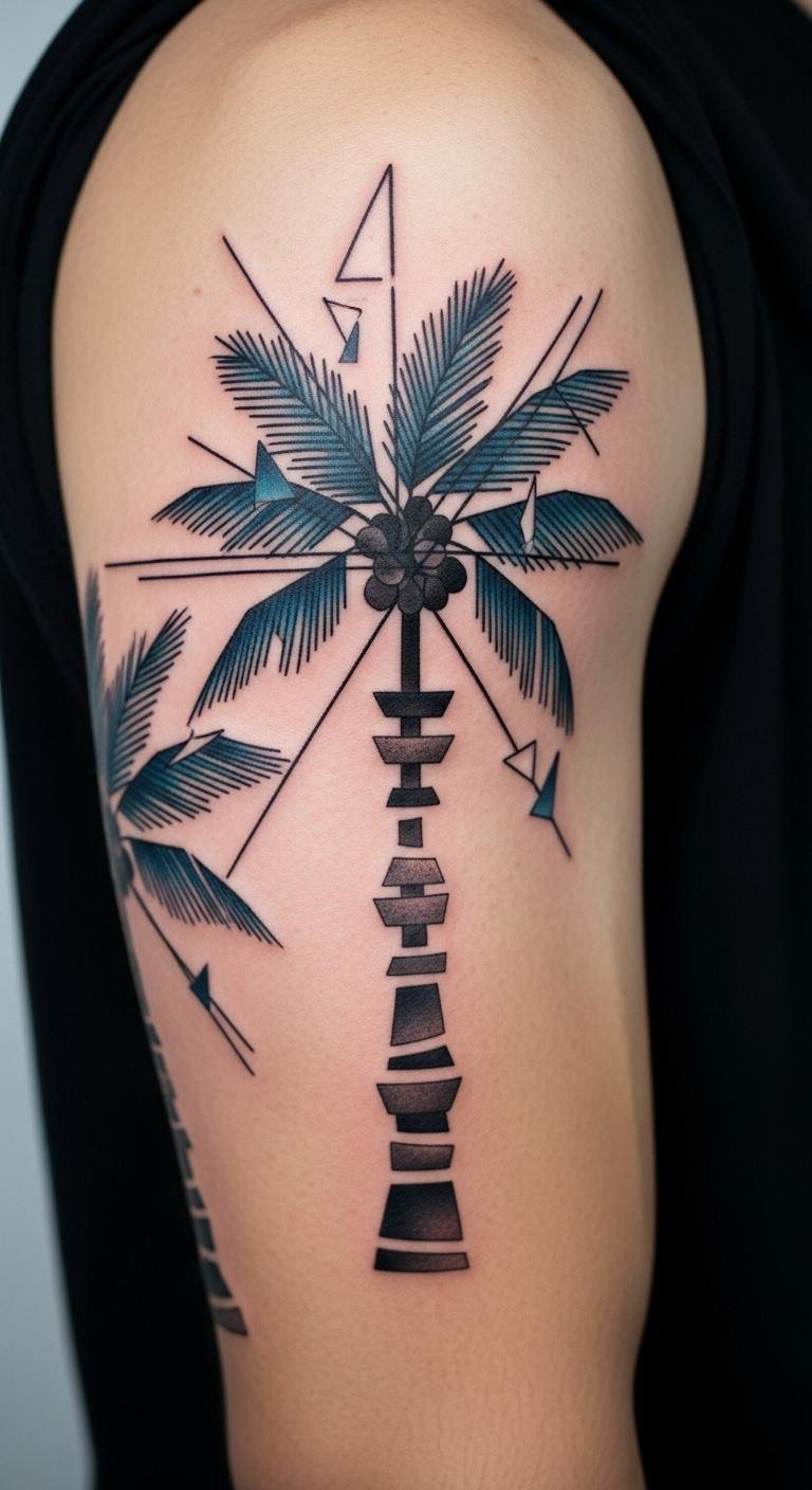 Abstract palm tree art uses shapes for a contemporary twist. Picture it on your arm with fluid forms. Experiment with abstract drawings. For testing, use abstract stickers. Arm areas show well. Costs around $130. Protect during activities. This one sparks creativity. Mix in personal abstracts. Try digital tools first.