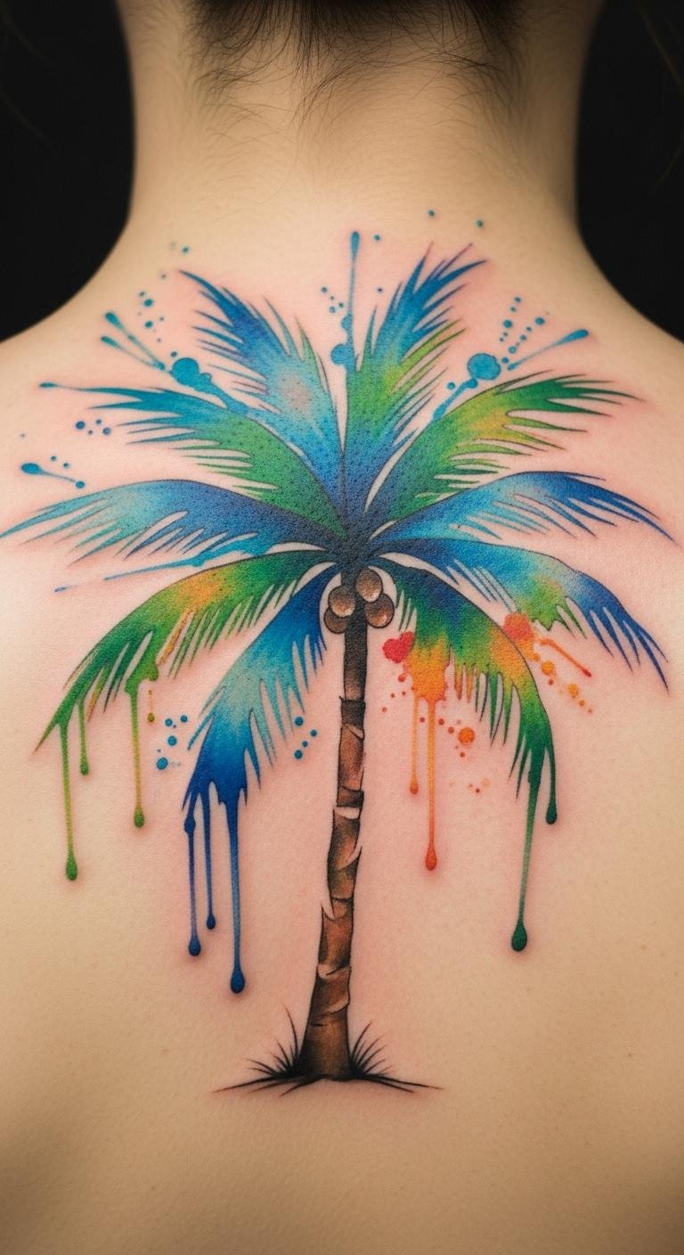 A watercolor style palm tree tattoo uses soft, blended colors for an artistic touch. Imagine fuzzy greens and blues on your back. It’s perfect for creative types. Blend colors with kid’s paints at home to practice. For DIY, apply with a sponge on paper. Choose spots like the shoulder for comfort. Expect costs around $150 at a studio. Cover with soft fabric for healing. This design feels like a painting. Add your color preferences easily. Use free online tools to simulate it on your body. Keep it light to prevent quick fading.