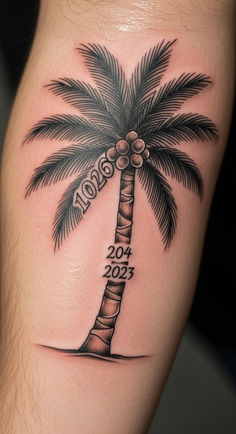 A personalized palm tree with date tattoo adds meaning, like marking a trip year. See the tree with numbers on your arm. It’s sentimental and unique. Write dates in your notebook to plan. For DIY, stamp with ink pads at home. Opt for wrist spots. Costs run about $100. Use daily cream for upkeep. This one holds memories. Include initials for more personalization. Test with temporary stamps. Make it special with simple tweaks.