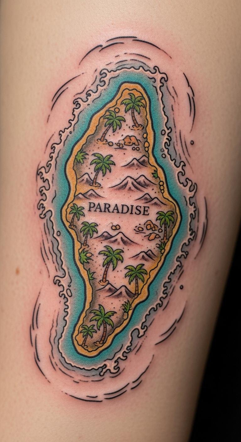 Maps of islands spark travel dreams. Ink it on your arm for inspiration. Draw a simple map on paper first. Customize with your favorite spots. Look for flash deals to save money. Keep healing straightforward with over-the-counter creams. Practice with free apps for designs. This idea fits tight budgets easily.