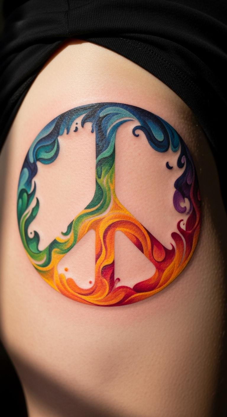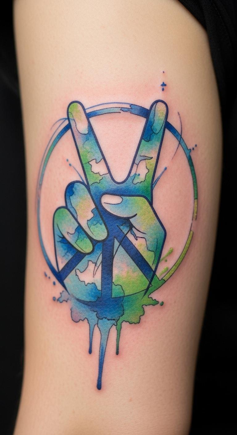 A watercolor arm peace sign brings vibrant colors to life, like splashes of blue and green blending softly. Imagine soft edges that mimic real paint for a dreamy effect. Try mixing watercolors at home to sketch ideas on paper before committing. Affordable art supplies from a craft store let you create mock-ups for under $10. Place it on your arm for easy visibility during activities. Opt for a smaller version to save on tattoo costs, possibly $100-200. Add elements like subtle flowers using free online templates. This design pops in photos, making it great for social shares. Practice with washable markers on your arm to adjust the flow. Keep it fresh by choosing colors that match your wardrobe.