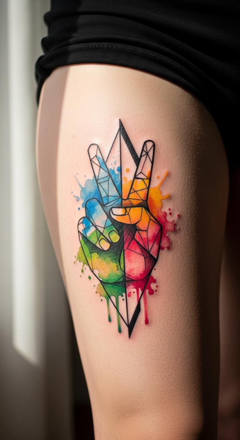 A watercolor and geometric mix on your thigh combines colors and angles for balance. Imagine geometric cores with watercolor flows. Blend sketches on paper at home. Mixed stencils help preview cheaply. Place it on the thigh for a dynamic area. Hybrid designs might cost $150-250. Create mixes with basic art supplies. This style evolves with you, offering versatility. Test with thigh wraps. Fuse elements creatively.