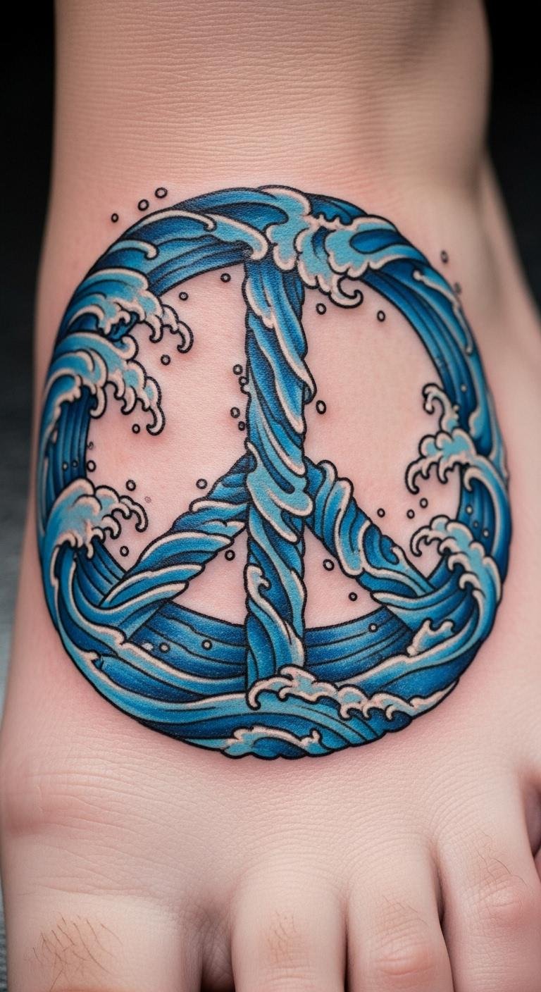 A peace sign with waves on your foot evokes ocean themes with curving lines. Picture blue waves around the symbol. Draw wave patterns on paper freely. Wave stickers aid in testing. Opt for the foot for a grounded feel. Wave additions could be $60-110. Use water-based pens for home trials. This design suits beach lovers, visible in sandals. Experiment with foot templates. Keep waves fluid.