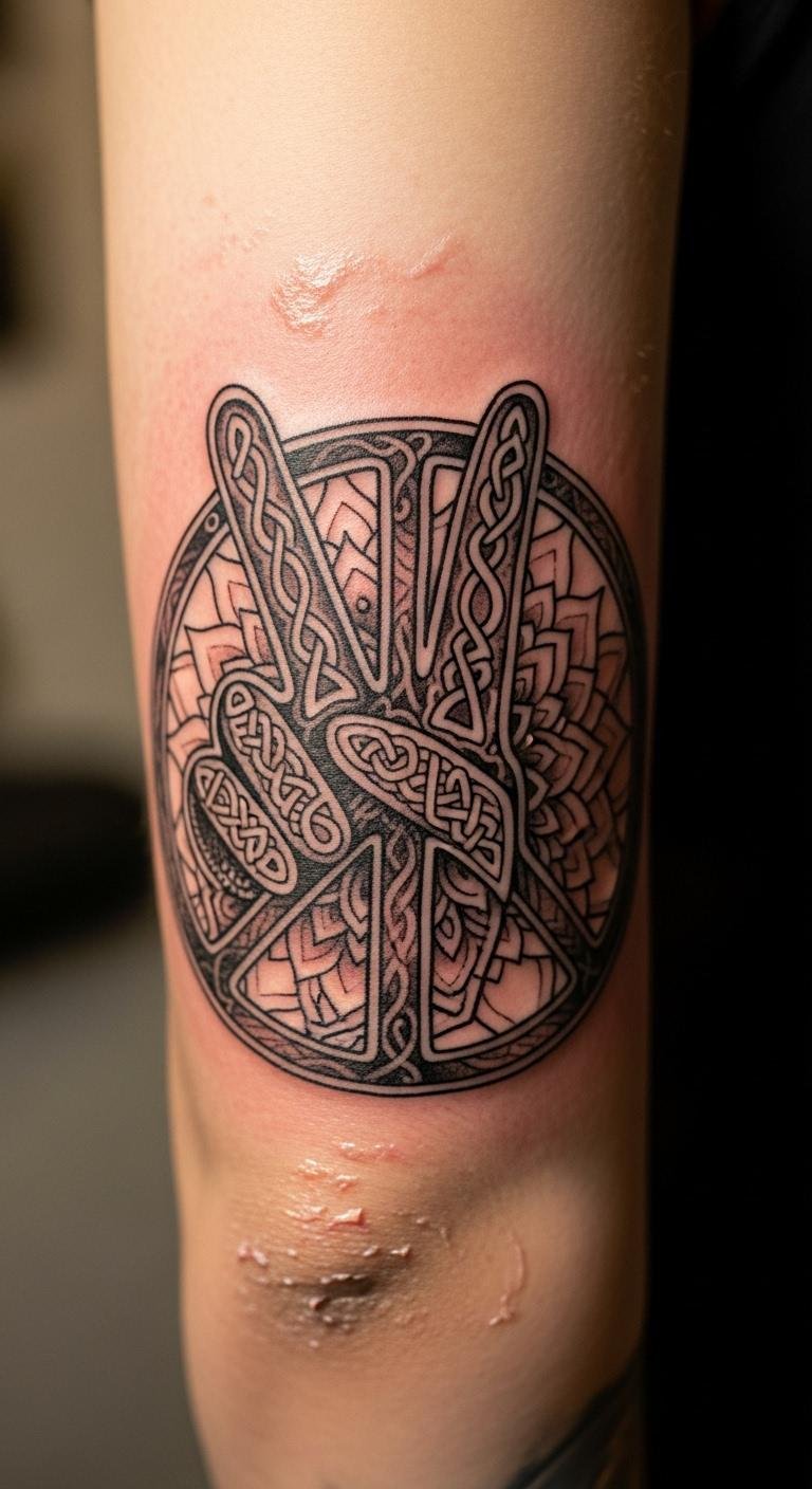 A detailed elbow peace sign fills the symbol with patterns for intricacy. Think of inner designs that catch the eye. Plan on paper with detailed drawings. Elbow wraps help test affordably. Position for joint movement. Detailed work might be $100-180. Build details with DIY tools. This tattoo flexes with you, adding character. Try with elbow pads. Layer thoughtfully.