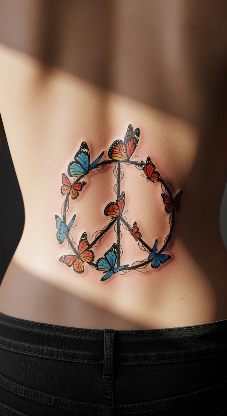 A peace sign with butterflies on your lower back adds flying elements for lightness. Picture colorful butterflies around it. Sketch butterflies on paper simply. Butterfly stencils make testing easy. Place on the lower back for privacy. Butterfly accents could cost $90-160. Create with home stamps. This design symbolizes transformation, hidden yet powerful. Experiment with back drawings. Keep it light.