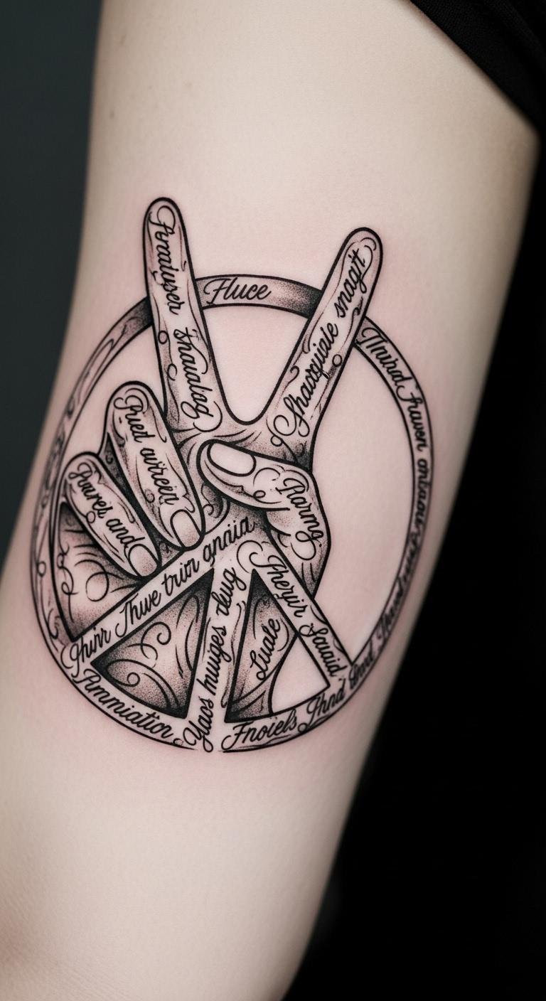 A peace sign with quotes on your arm weaves in meaningful words. Think of phrases that inspire daily. Write quotes on paper first. Arm bands with quotes help preview. Place for arm visibility. Quote integrations could be $80-140. Use home lettering tools. This design motivates during routines. Test with arm wraps. Choose resonant words.