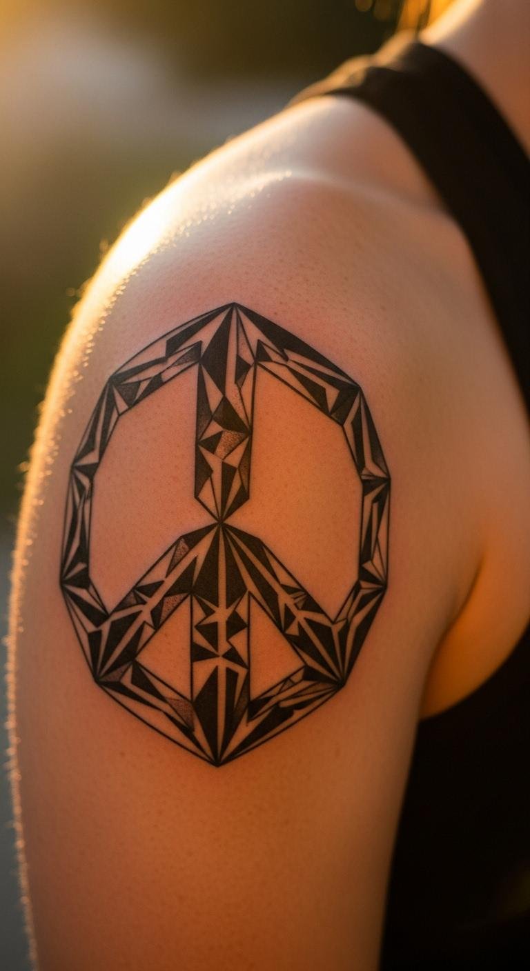 A geometric shoulder peace sign uses shapes like triangles and circles for a modern twist. Picture precise lines forming the symbol with added symmetry. Draw grid patterns on paper with a ruler to plan your design cheaply. Use geometric stencils from online freebies to trace on your skin first. Position it on your shoulder for a balance of hide and show. A simple version might cost $80-150 at a walk-in shop. Incorporate DIY elements by adding dots with a fine-tip pen at home. This tattoo stands out in fitted clothes, boosting your everyday look. Test with temporary stickers to fine-tune the placement. Focus on clean angles for lasting appeal.