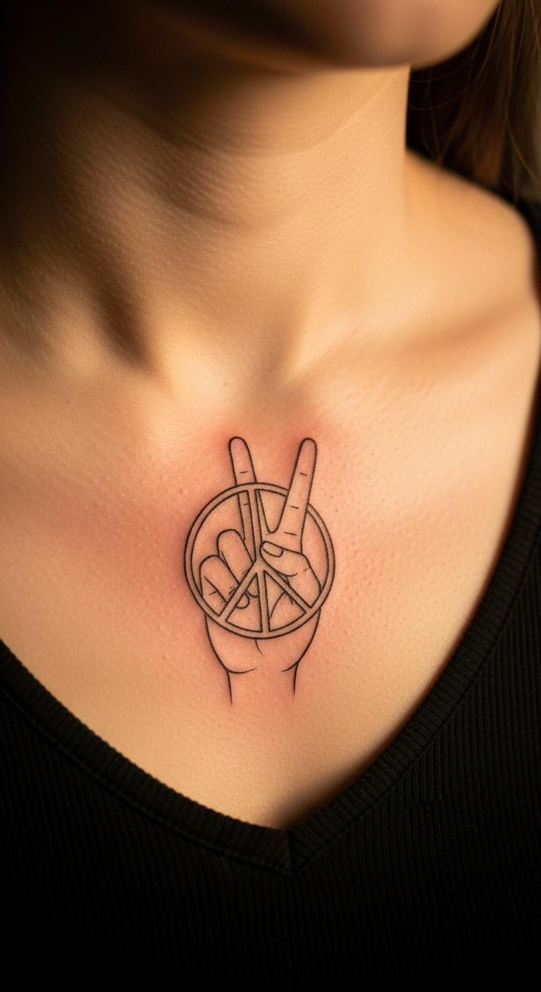 An elegant collarbone peace sign uses fine lines for sophistication. Picture a sleek design along the bone. Sketch elegantly on paper. Collarbone templates assist testing. Position for neckline appeal. Elegant tattoos might cost $60-110. Add with DIY finesse. This style enhances outfits subtly. Practice with neck scarfs. Keep lines graceful.