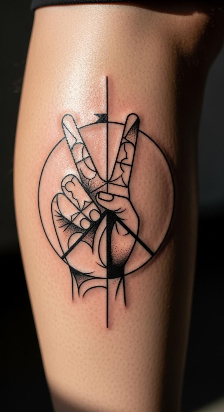 A dotwork finger peace sign creates texture with small dots, offering a subtle yet detailed look. Think of precise points building the symbol for a unique feel. Practice dot techniques on paper with a pen to plan ahead. Grab a dot stencil kit for under $5 to test on your finger first. Choose a spot that’s discreet for work settings. A tiny design could cost just $40-80. Incorporate DIY by using a toothpick and ink for home trials. This tattoo fits rings or gloves easily, making it practical daily. Try with washable ink to perfect the density. Keep dots even for a polished result.