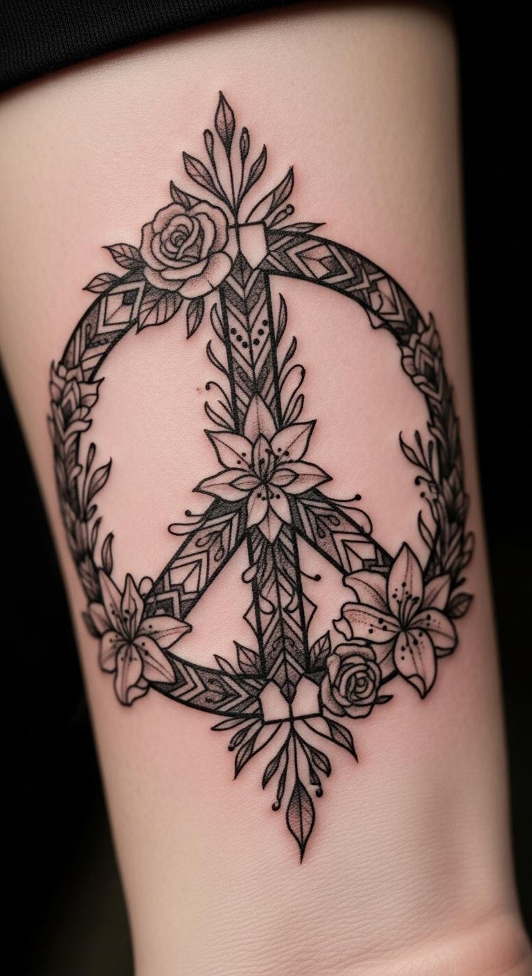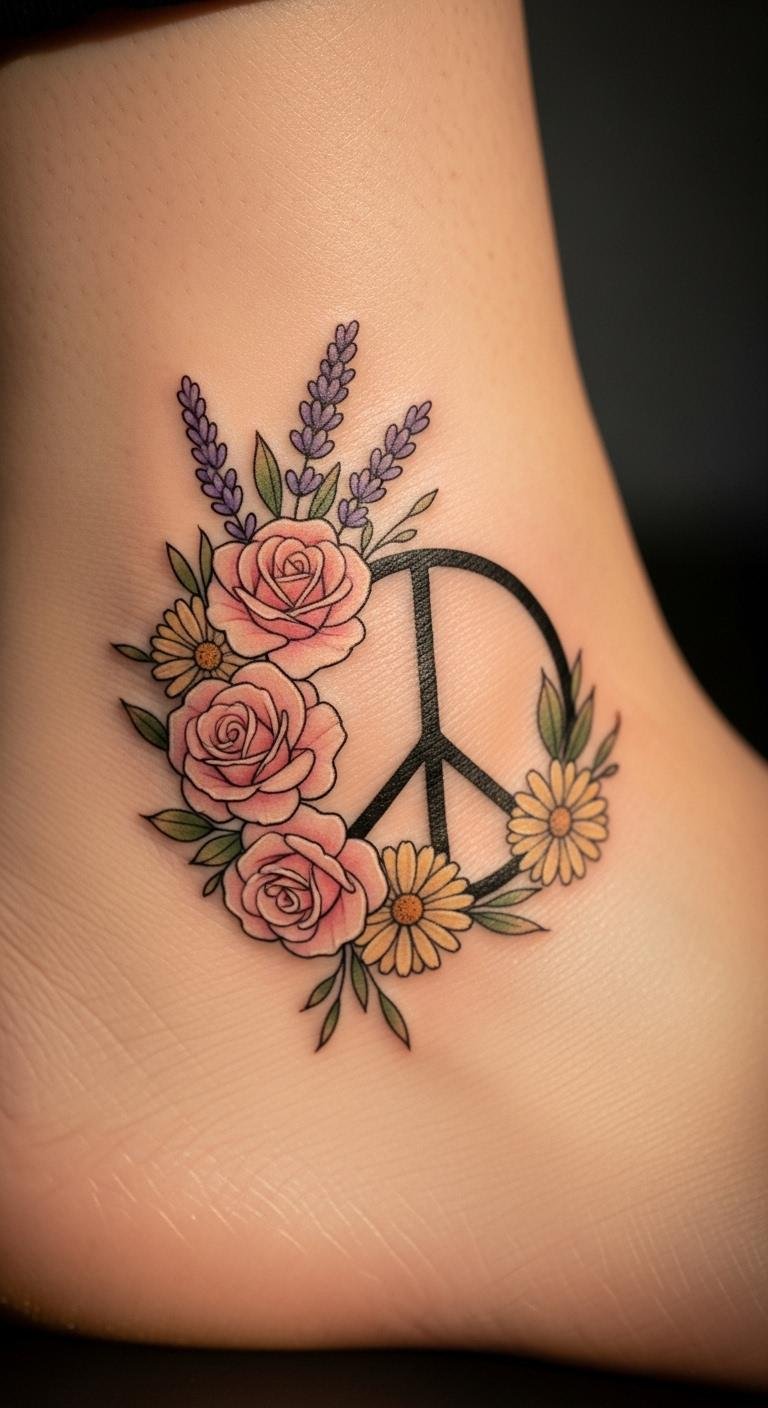 A peace sign with flowers on your ankle adds a feminine touch, like roses blooming around the edges. Visualize soft petals in simple colors enhancing the design. Draw flower outlines on paper with colored pencils for ideas. Use flower stickers as cheap templates to preview on your skin. Position it on the ankle for easy coverage with socks. A modest add-on might run $60-120. Create your own version at home with flower stamps and paint. This style complements summer outfits, adding a pop of nature. Experiment with petals using safe markers. Blend elements for a personalized story.