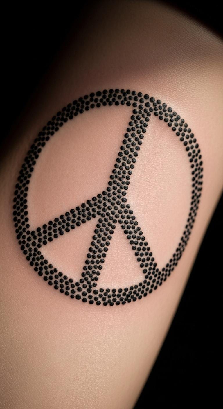 A bold dotwork peace sign on your arm uses heavy dots for emphasis. Think of layered dots building strength. Sketch dot patterns. Arm dots help test. Position for arm display. Bold versions might be $90-160. Add with DIY dots. This design grabs attention effectively. Experiment on arm skin. Keep dots prominent.