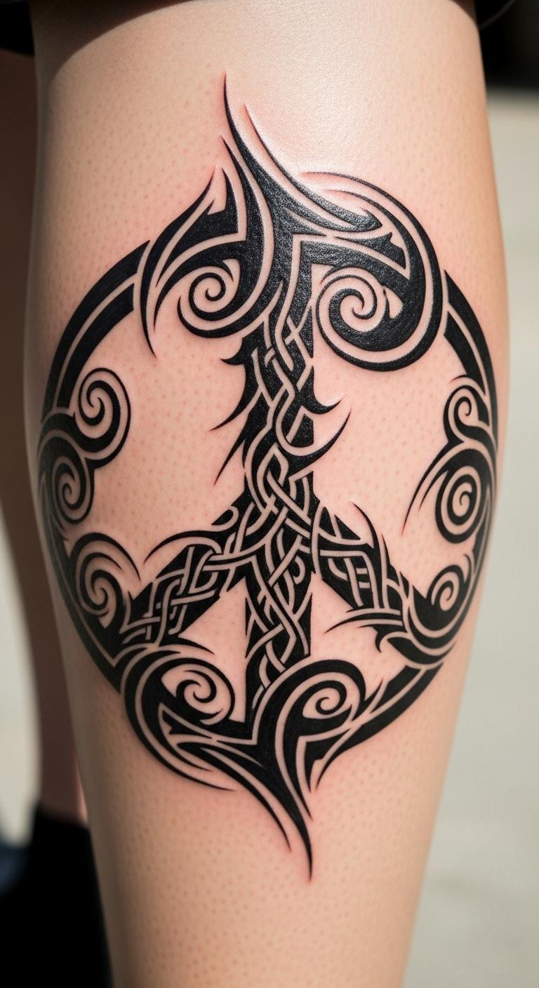 A tribal calf peace sign mixes cultural motifs with bold lines for a strong statement. Envision swirling patterns around the core symbol for depth. Sketch tribal designs on paper using free tutorials online to start. Affordable henna kits help you try it temporarily without ink. Place it on your calf for movement and flexibility. Keep expenses down with a basic design, around $100-180. Add personal touches like simple waves using household items for practice. This style suits active lifestyles, visible in shorts or jeans. Experiment with body paint to adjust the flow. Make it your own by blending in family-inspired elements.