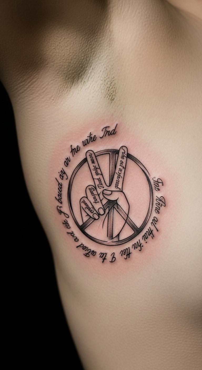 A quote-integrated peace sign on your rib combines words like “hope” with the symbol for deeper meaning. Envision simple script wrapping around it neatly. Write quotes on paper to select your favorite. Use letter stencils for under $10 to try on your side. Opt for the rib to keep it personal yet impactful. A straightforward design may cost $100-200. Incorporate quotes with home-printed transfers. This tattoo inspires during quiet moments, hidden under clothes. Test with body tape for positioning. Choose words that resonate personally.