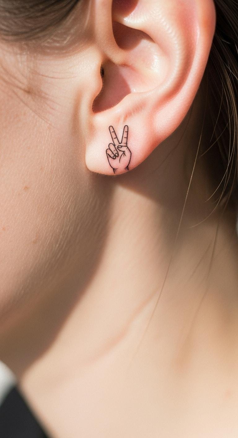 A small ear peace sign fits behind the ear for a discreet option. Think of tiny lines that are easy to conceal. Draw mini designs on paper with a fine pen. Ear-friendly temporary tattoos cost pennies to test. Place it near the hairline for versatility. Quick sessions might be $30-70. Add tiny details with DIY dot tools at home. This style works with earrings, adding a subtle edge. Experiment with ear models made from clay. Keep it small for everyday comfort.