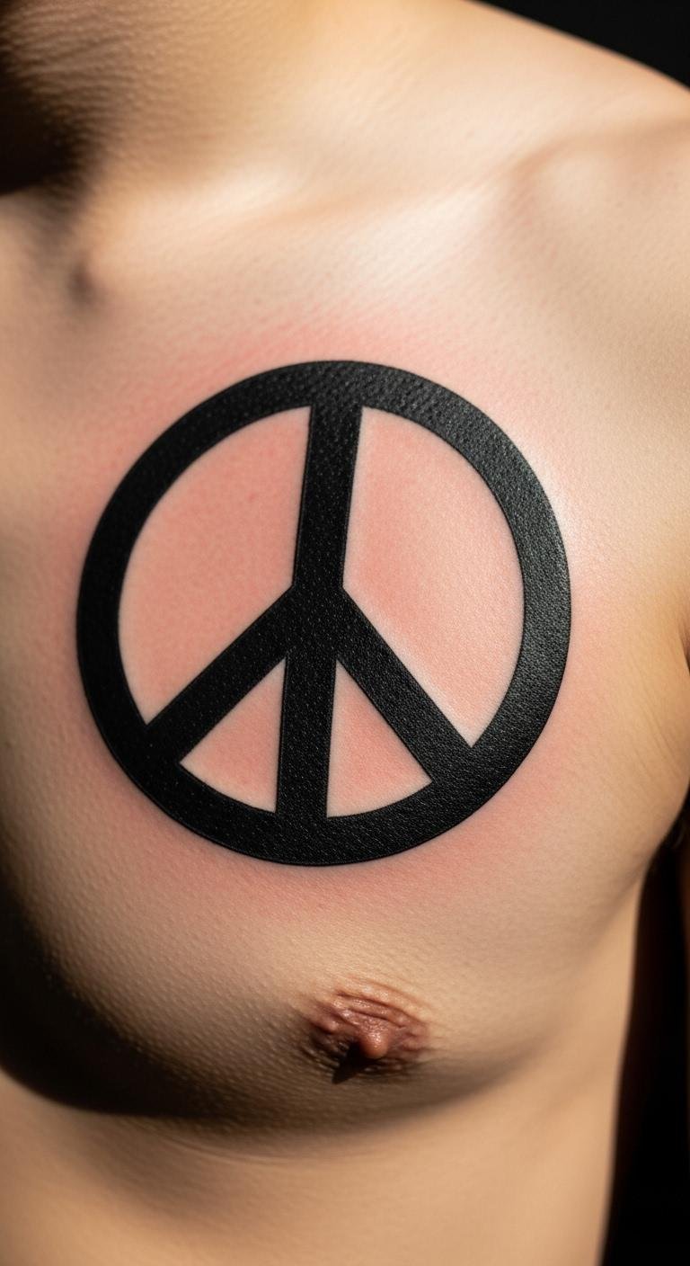 A bold chest peace sign uses thick lines for a statement piece. Imagine a larger design centered on your chest. Outline ideas on a mirror with washable markers. Chest templates from free apps help visualize. Position it for symmetry and balance. Larger tattoos could be $200-300, but scale down to save. Build it with layered drawings at home. This design stands out in active wear, radiating confidence. Practice with fabric markers on shirts. Make it bold yet meaningful.