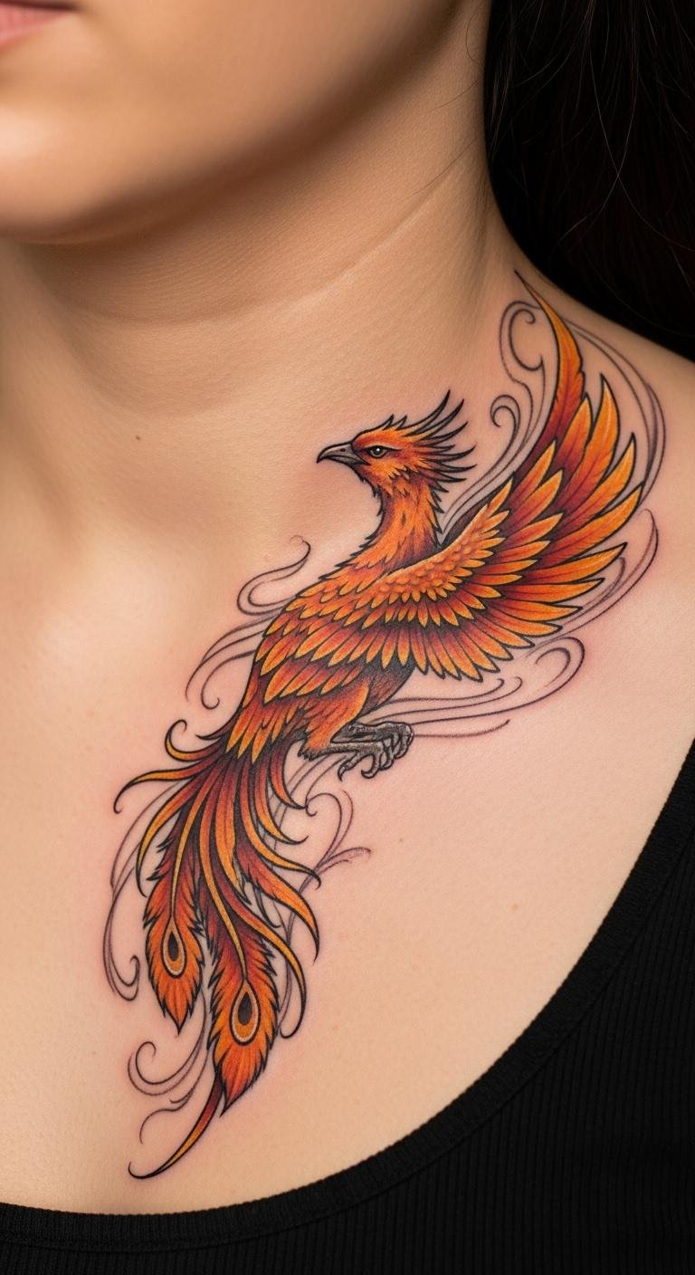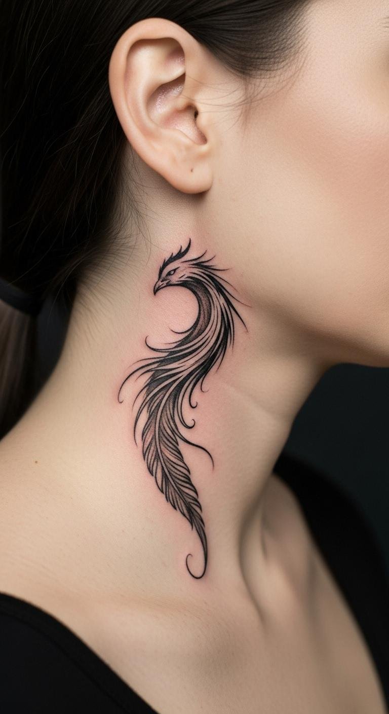 Imagine a slender Phoenix curling around your neck, symbolizing quiet strength. This spot keeps things subtle yet powerful. Draw your idea on your skin with washable markers first—it’s free and fun. Pick up an affordable stencil kit online to test placements at home. Look for artists offering package deals to cut costs. Add elements like a small star for extra meaning. The neck shows resilience without overwhelming your look. Wear a scarf to hide it during healing. This design turns heads and boosts your confidence in tough moments.