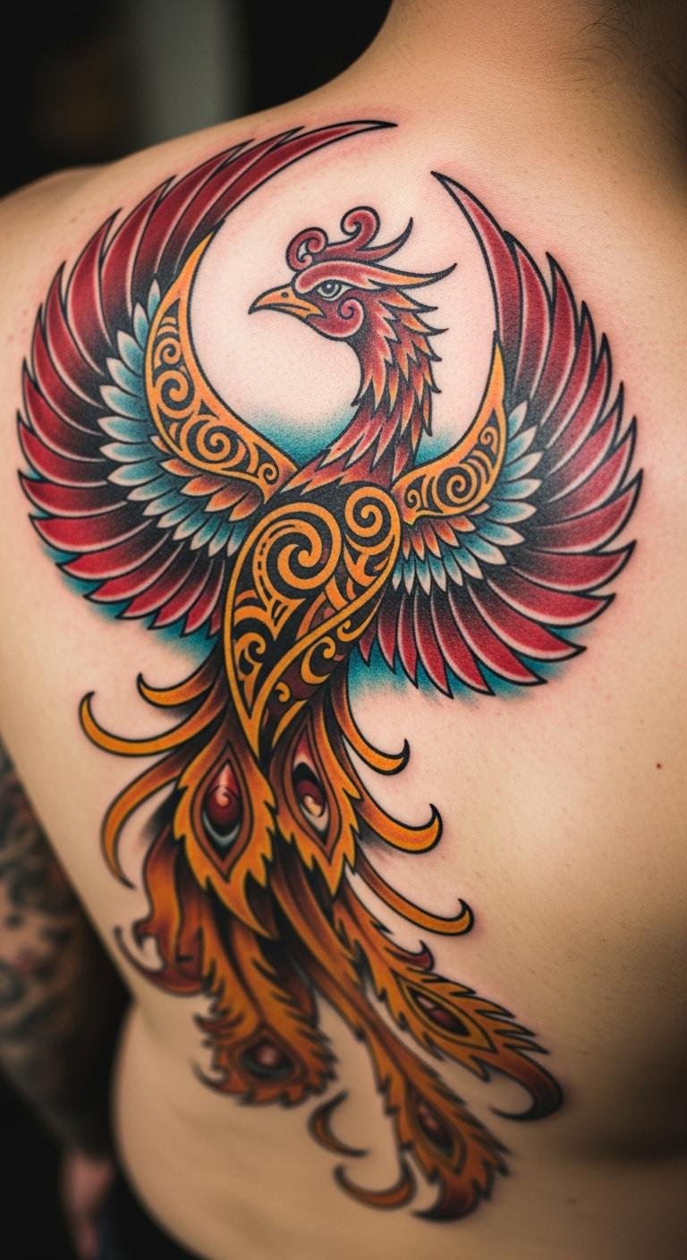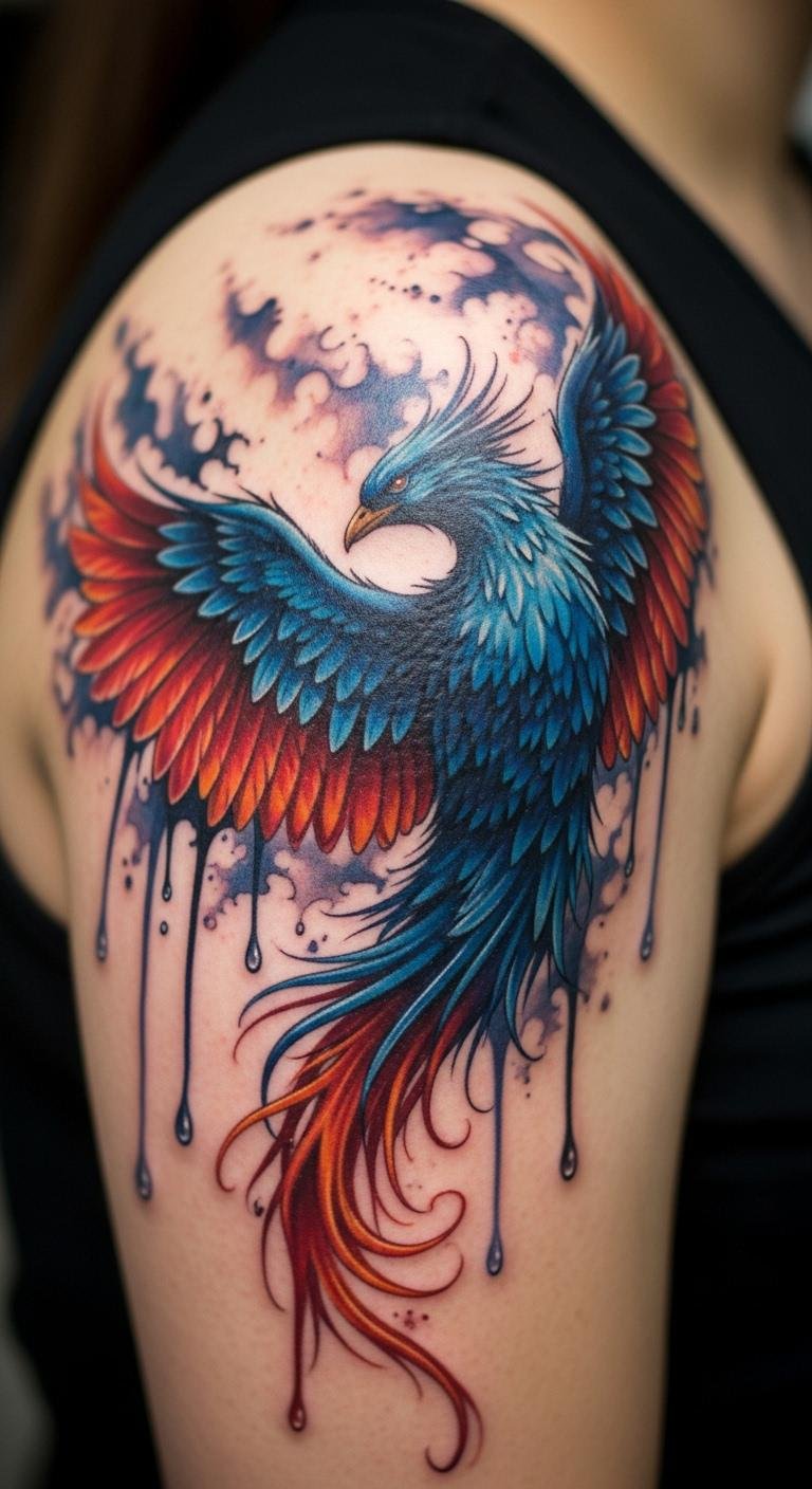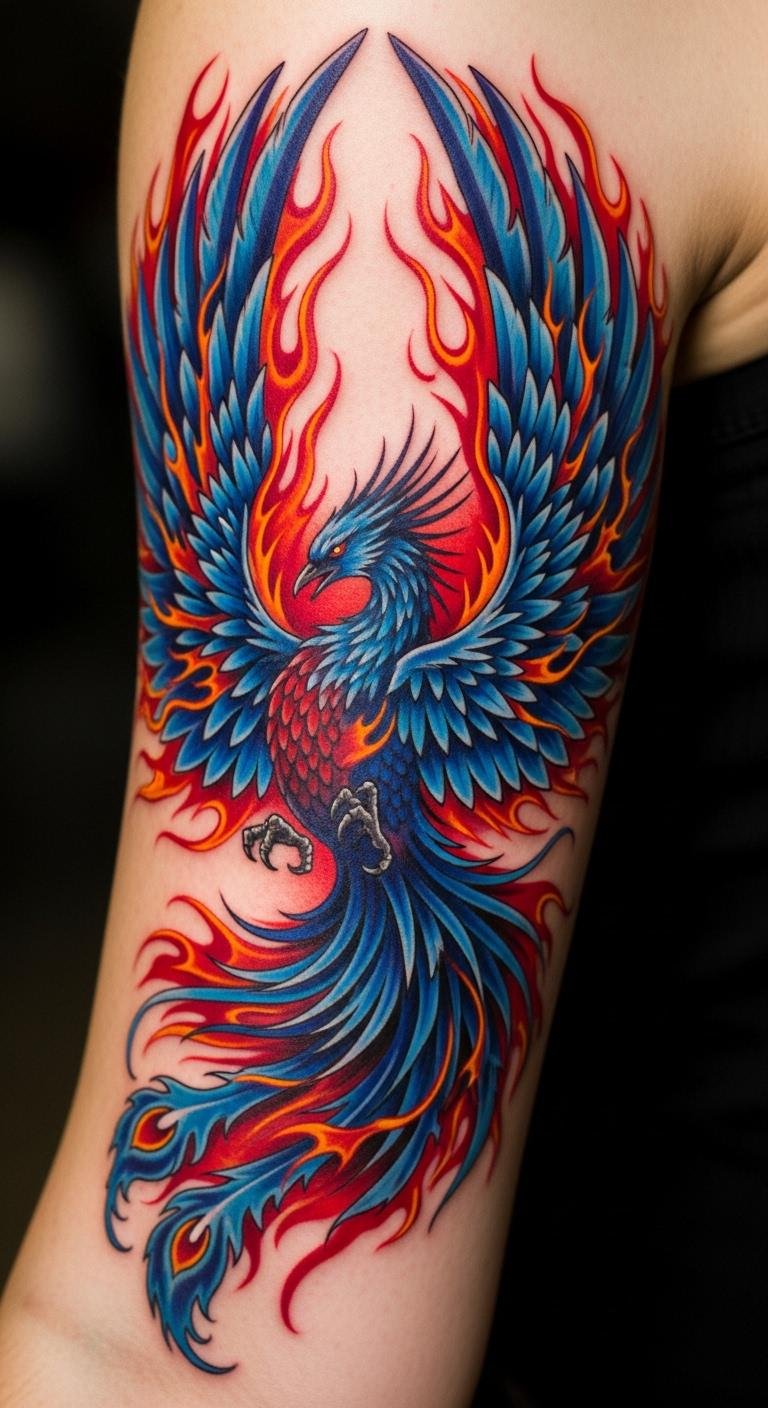 See a Phoenix bursting with colors on your arm, representing fresh starts in every shade. The mix of blues and reds adds energy to the classic theme. Experiment with colored pencils on paper to design your own—supplies cost pennies. Use temporary tattoo paper from craft stores for a trial run under $10. Find artists with student discounts for savings. Incorporate a personal symbol, like a heart, into the flames. Bright inks stand out, but start small to keep expenses low. This tattoo brings joy and reminds you of inner fire.