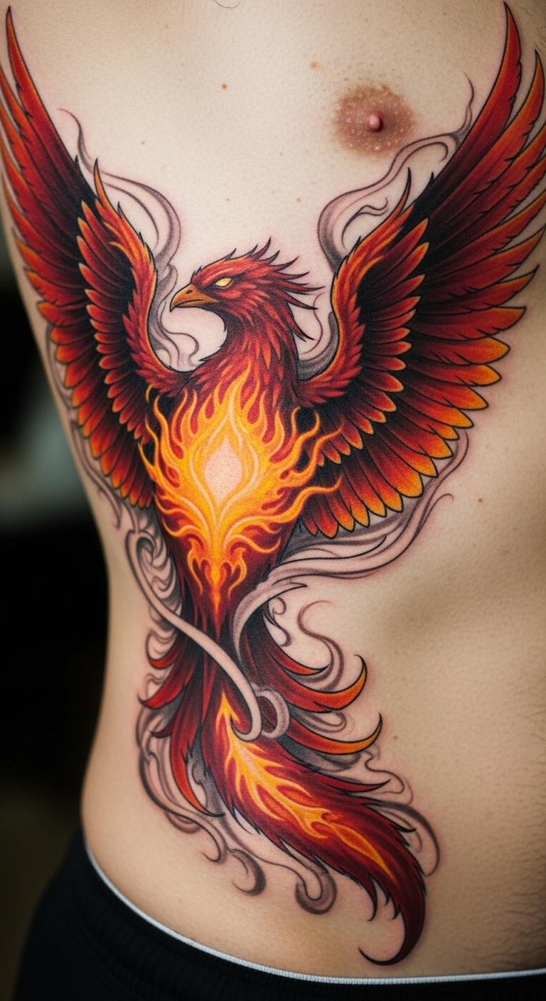 Imagine a Phoenix on your ribcage, fueling inner fire. The curves hug your body. Trace on your side with care. Use ribcage temporaries for inner checks. Look for fire artists with options. Add a flame for your spark. This tattoo fires up inside, staying budget-friendly. It ignites from within.