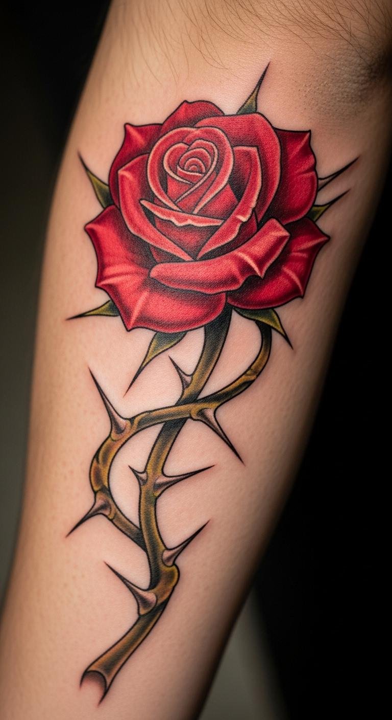 Add some edge to your ink. A red rose with thorns mixes beauty and toughness. The thorns stand for protection or life’s challenges. Place it on your forearm for easy show-off. Sketch options at home using basic drawing tools. Budget-friendly tip: Look for flash sales at studios to cut costs. This design might run $150 or less. Combine it with a personal symbol, like a date, for meaning. Real DIY: Try a temporary tattoo kit from the store to preview. Use gentle soaps for healing to avoid irritation. Keep the design small for quicker sessions. Bold the thorns in your mind for emphasis. It’s a great way to tell your story affordably.