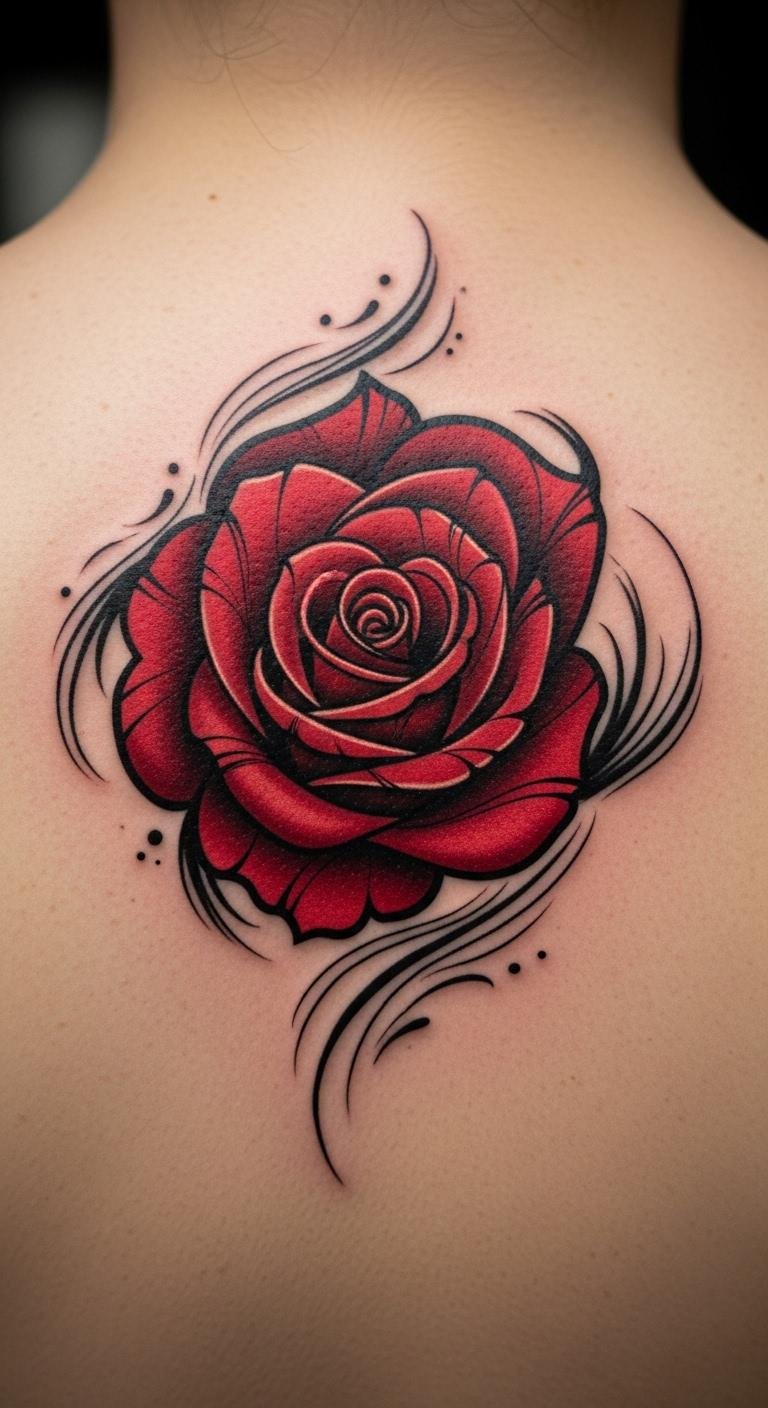 Go abstract for fun. An abstract red rose swirl adds movement. Place on the back. Draw freehand ideas. Affordable with line work. Around $170. Real DIY: Swirl paints on paper. Use common lotions. Bold swirls stand out. Simple sessions fit.