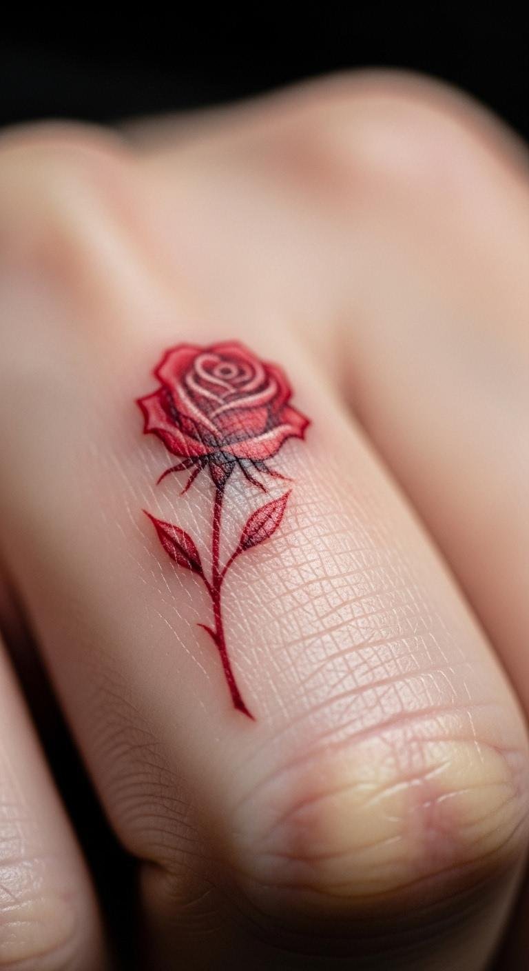 Keep it tiny and trendy. A delicate red rose on a finger is discreet. Use fine tools to plan. Budget: Finger tattoos are cheap, under $80. Real DIY: Draw on rings first. Heal with hand cream. Easy daily wear.