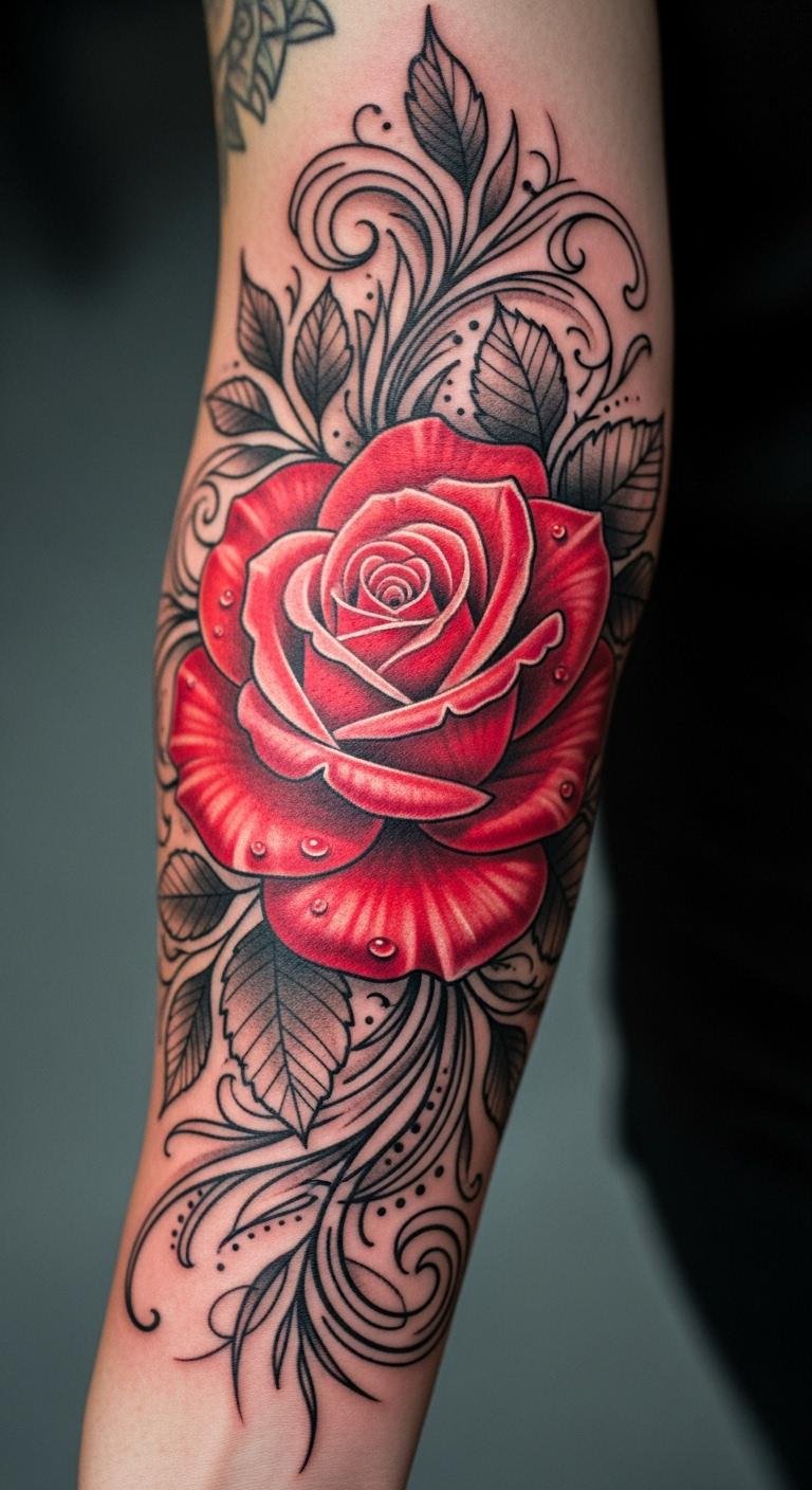 Aim for lifelike art. A realistic red rose mimics a real flower. It adds depth to your arm. Practice with photos for ideas. Save by choosing partial color. Costs about $220. Real DIY: Use phone apps to overlay designs. Aftercare with cheap ointments. Place it where you can admire it daily. Bold details make it pop. This brings nature to your skin on a budget.