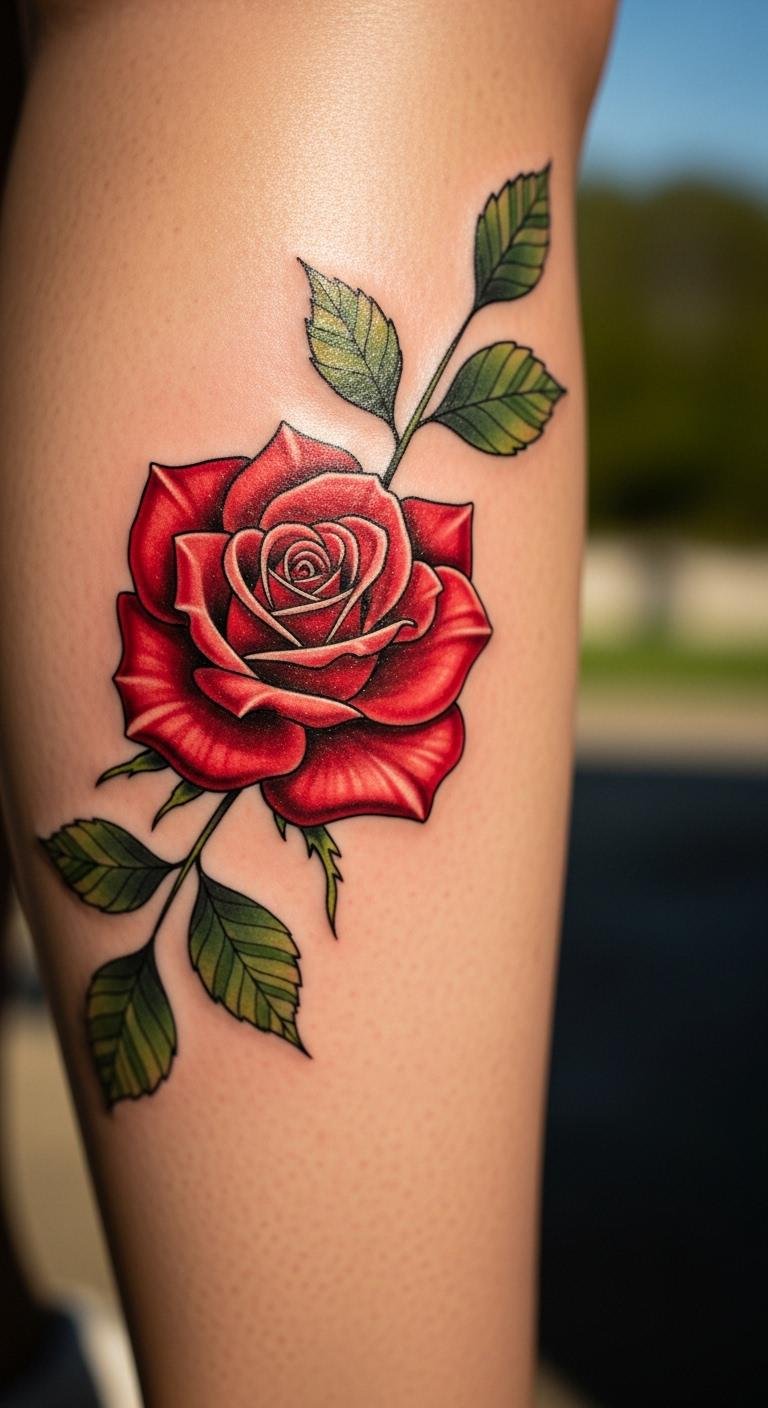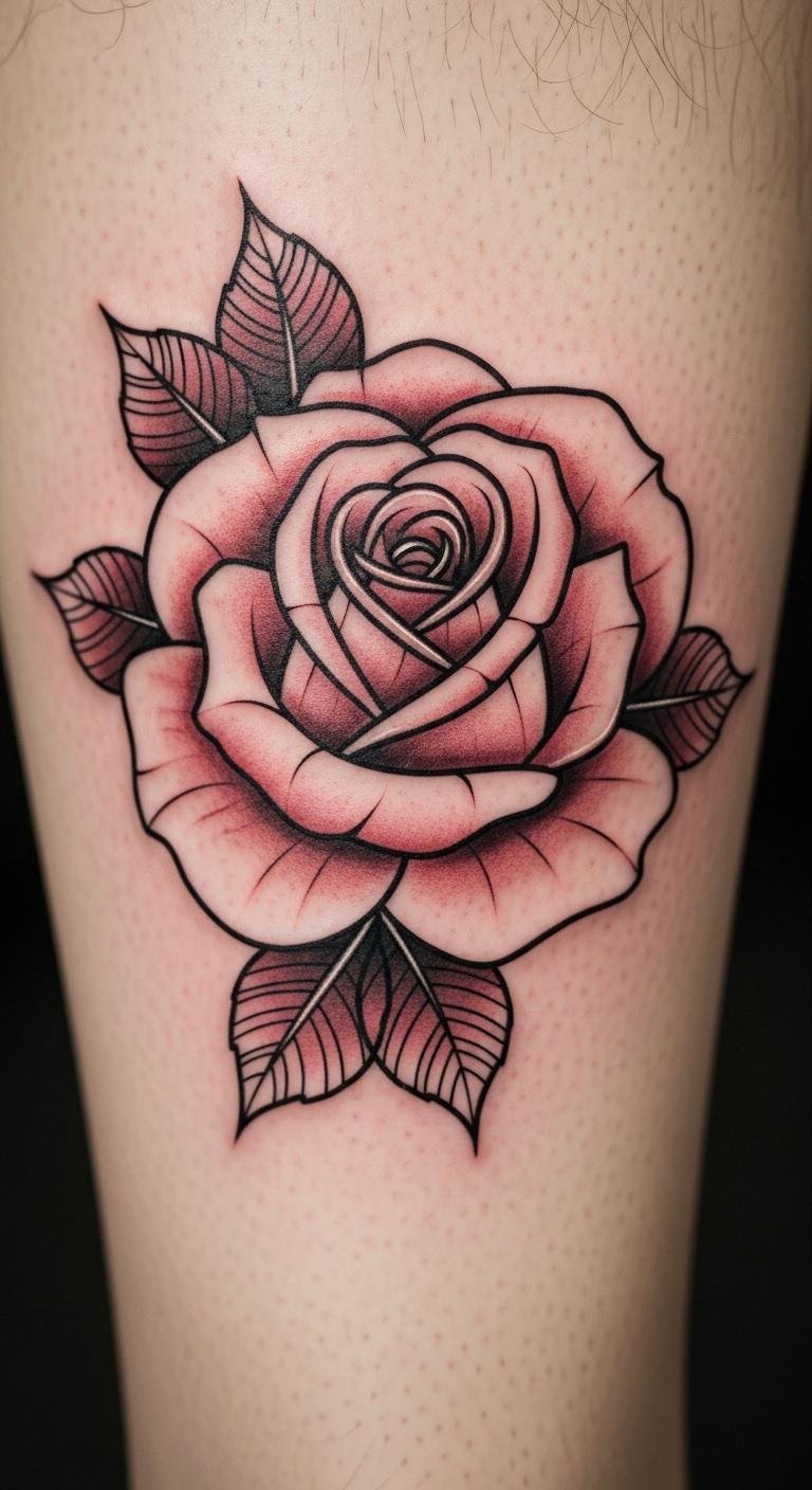 Add some shadow play. A shaded red rose outline gives dimension. Put it on the calf. Sketch shades yourself. Budget-friendly with outlines. Around $120. Real DIY: Shade with pencils. Use basic care. Bold shades enhance.
