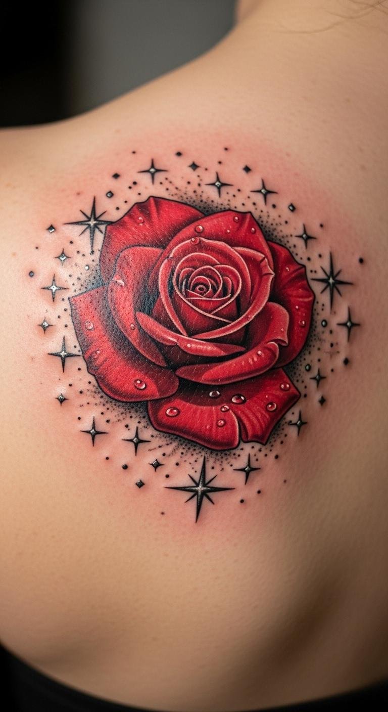 Add a starry touch. A red rose with stars brings whimsy. Shoulder blade hides or shows. Online stars help design. Save with small stars. Around $160. Real DIY: Star stickers first. Standard healing. Sparkle effect.