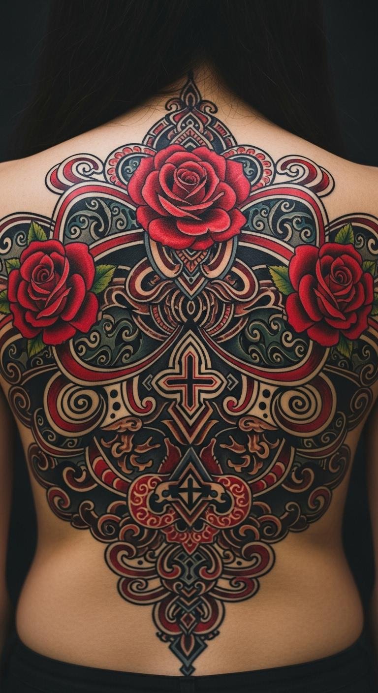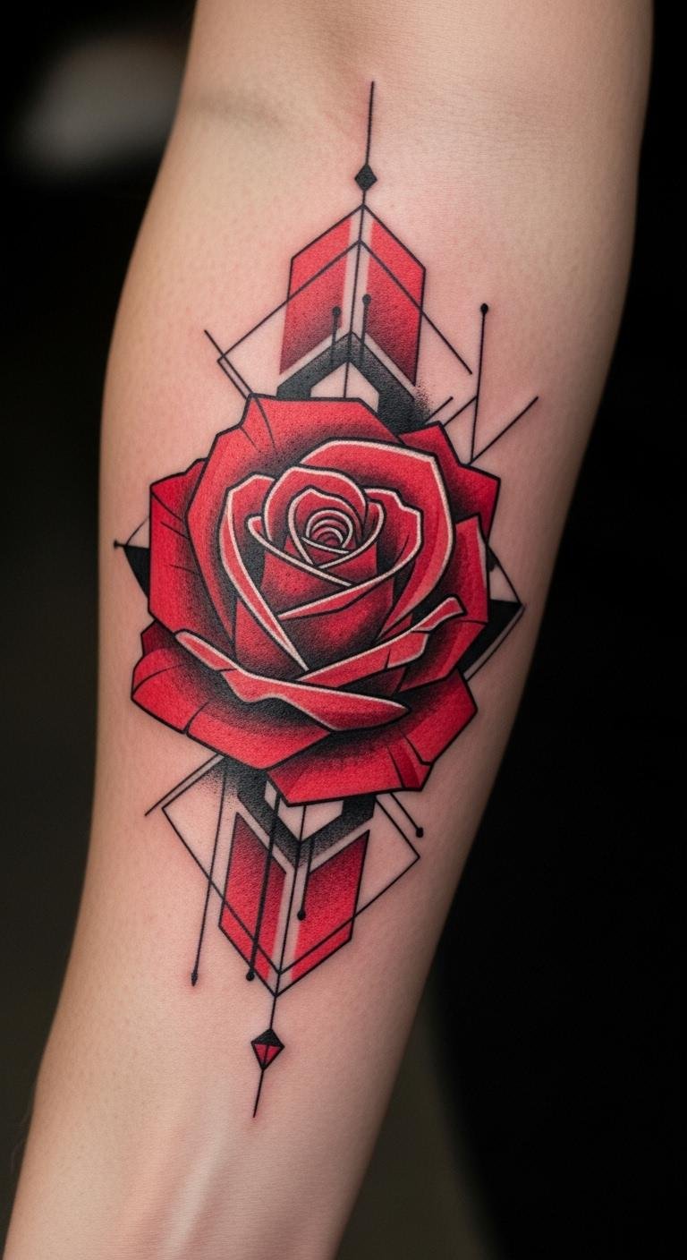 Mix shapes and flowers. A geometric red rose combines angles with the bloom. It symbolizes strength and balance. Place it on your forearm for visibility. Use graph paper to plan at home. Budget idea: Find artists offering student discounts. Prices around $160. Real DIY: Build a template with string and pins. Aftercare with simple lotions works fine. Keep lines clean for a modern feel. Bold the patterns in your design. This adds a unique twist without breaking the bank.
