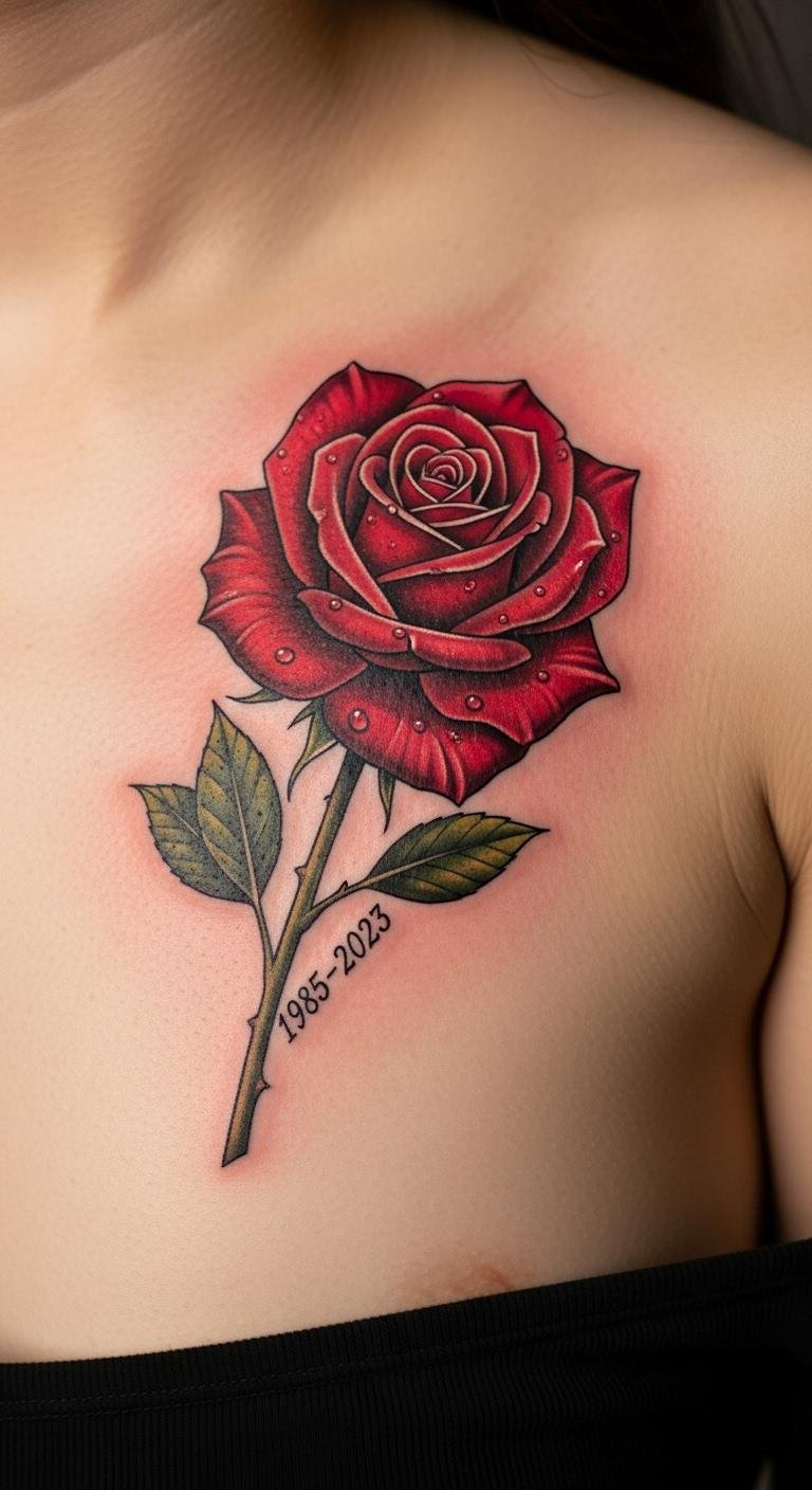 Honor someone special with this. A red rose memorial adds a name or date to the bloom. It represents love and remembrance. Put it on your chest for a heartfelt spot. Free apps help design it yourself. Budget tip: Ask about package deals at local parlors. Costs can be under $250. Real DIY: Create a mock-up with sticker tattoos first. Use affordable creams for aftercare. Keep the size modest for less pain. Bold key elements like the name. It’s a meaningful, low-cost way to keep memories alive.