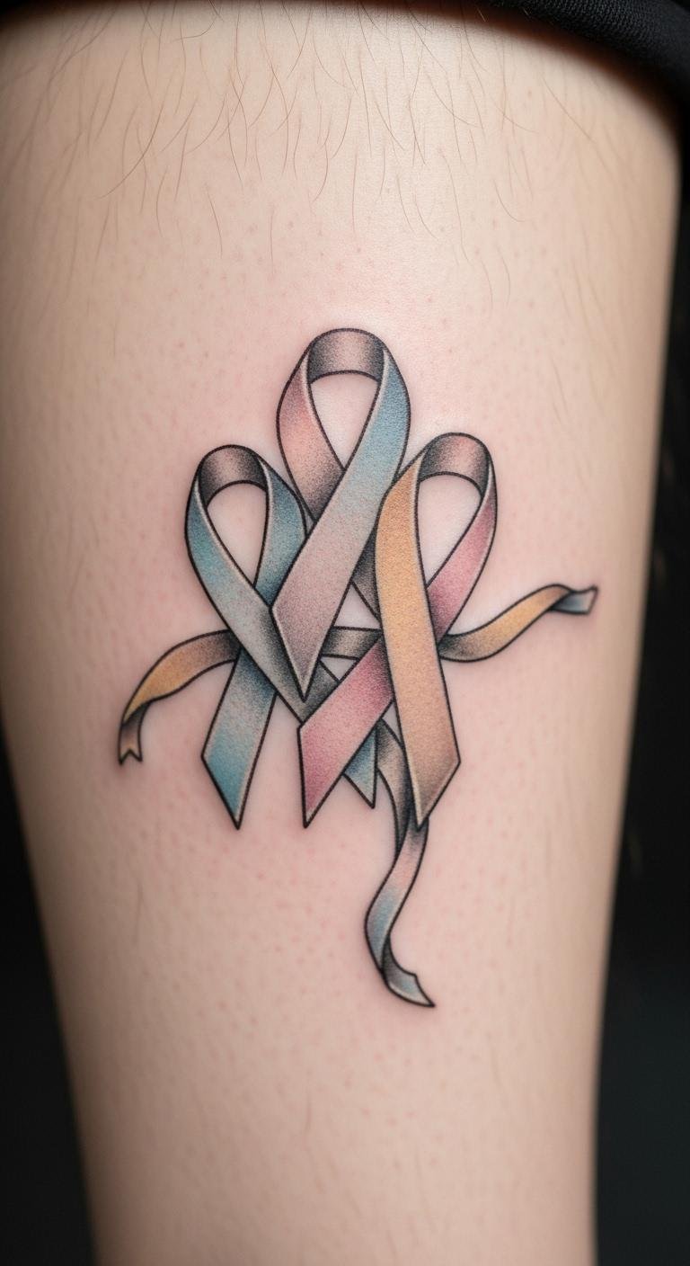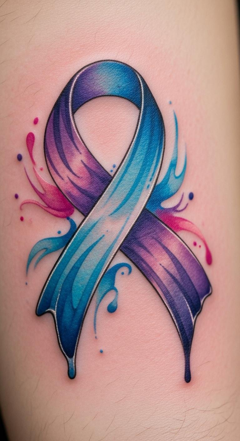 A watercolor style ribbon tattoo brings artistic flair and resilience to life. Pick this for a painterly effect. Start by blending colors on paper yourself. Free software shows how it might look. Watercolor blends create vibrancy affordably. Customize shades with home experiments. This works for colorful expressions of strength. Keep it light to manage costs. Use watercolors for DIY trials. It’s a fresh way to display courage. Begin drawing today.
