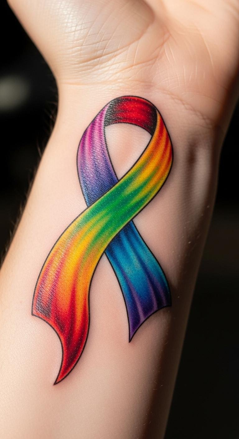 A multicolor ribbon tattoo celebrates LGBTQ+ pride and showcases resilience through vibrant hues. Choose this to make a bold statement with ease. Begin by mixing colors on paper to match your vision. Use free digital tools to overlay it on photos of yourself. Rainbow colors bring energy without high expenses. Add elements like stripes using simple drawings at home. This design pops on visible areas for everyday impact. Keep it straightforward to work with any budget artist. Practice with colored pencils for a fun DIY preview. It’s a great way to honor your story and connect with others. Start small to build from there. You’ll appreciate how it reflects your strength daily.