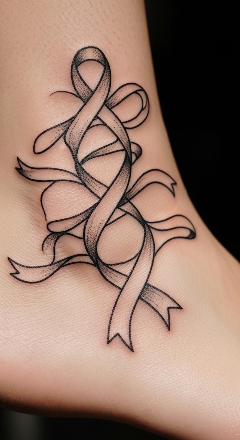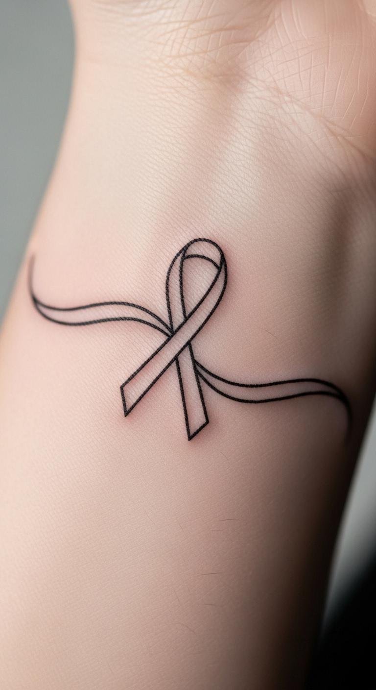A minimalist thin line ribbon tattoo offers clean strength with less detail. Select this for an understated approach. Begin by drawing straight lines on paper. Apps provide free previews on your skin. Thin lines keep it elegant at low cost. Add a twist with your own marker tests. This design fits small spaces for daily comfort. Choose basic styles to reduce expenses. Practice with rulers for precision. It’s ideal for beginners showing resolve. Get started with quick sketches.
