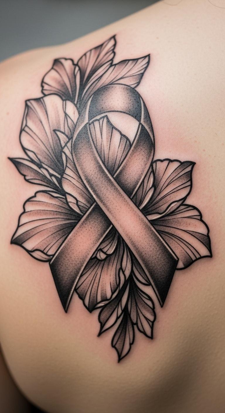 A flower-infused ribbon tattoo represents hope and growth, highlighting personal endurance. Choose this for a nature-inspired look. Start by drawing flowers and ribbons on paper. Use free tools to see how they blend on your body. Flower petals soften the ribbon at no extra charge. Customize with local blooms you sketch yourself. This design suits curved spots for a natural fit. Keep details minimal to stay budget-friendly. Practice with pressed flowers for inspiration. It’s a lovely way to show strength. Begin with simple doodles today.