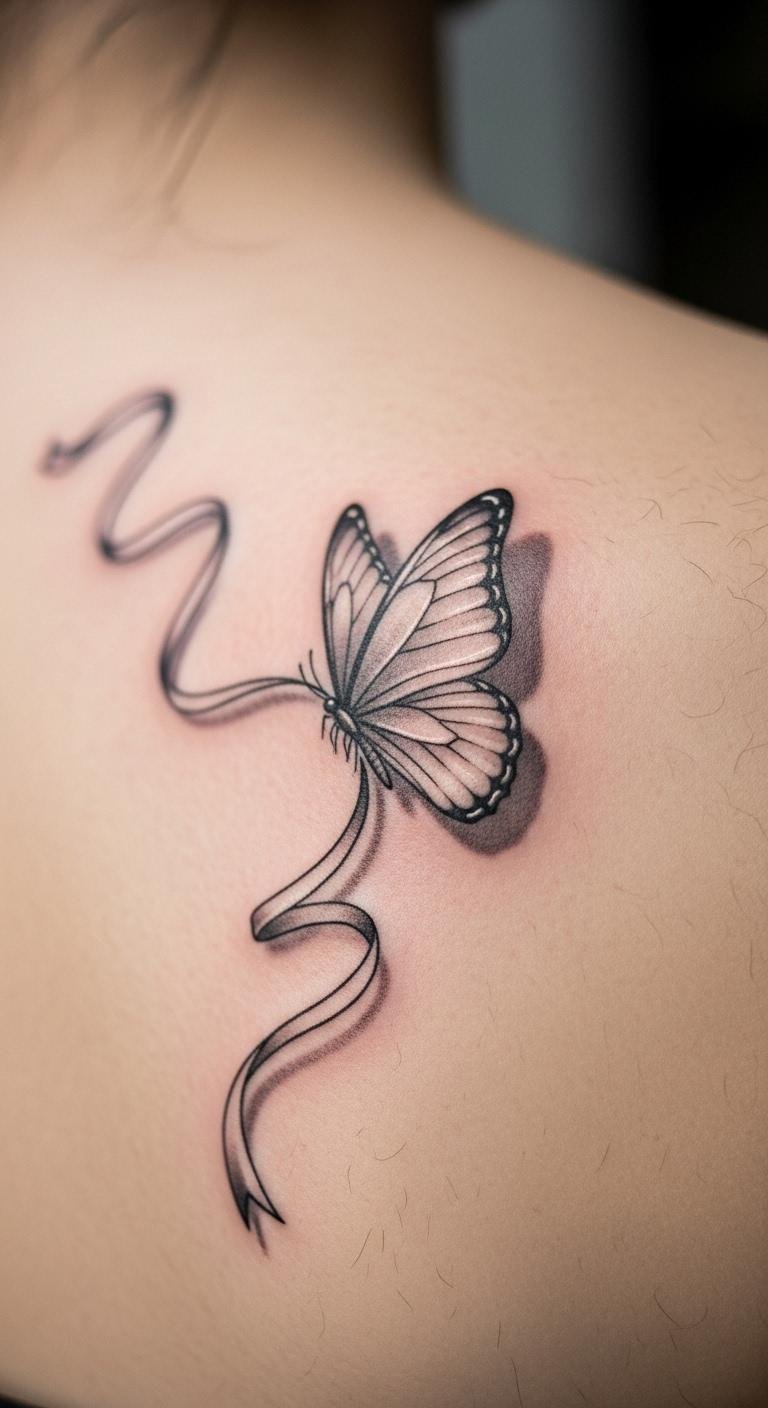 A butterfly and ribbon tattoo signifies transformation and courage through change. Go for this if you seek uplifting symbols. Kick off by sketching butterflies with ribbons at home. Free apps let you test positions easily. Butterfly wings add movement without high fees. Personalize by adding colors from your sketches. Use paper cutouts to visualize the flow. This option works for larger areas to tell a story. Opt for simple outlines to save money. It’s great for marking progress. Start practicing drawings now.
