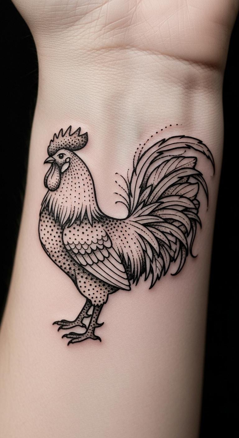 Rooster in dot and line mix offers variety. Draw mixes on paper. Select for $80. Balance elements. Position on your wrist for convenience. Explore online. This design diversifies. Go for quick setup. Protect as usual. Simple tips aid success.