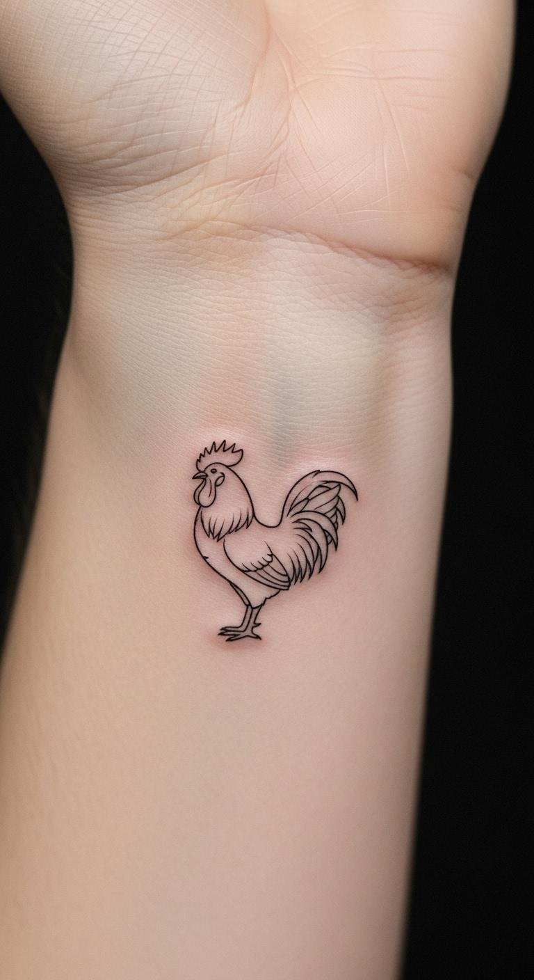 Simplified rooster outline fits small spaces. Jot outlines quickly. Choose artists for $60. Stick to essentials. Put on your finger for constant access. Use phone tools to adjust. This design offers ease. Go for fast work. Use home care. Simple choices make it approachable.