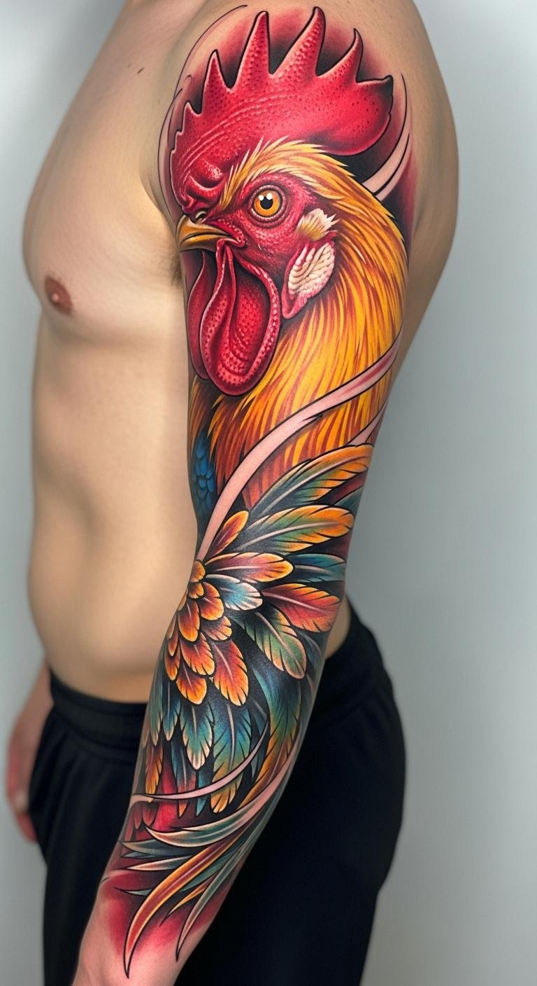 A colorful rooster sleeve builds a narrative of vibrancy. Plan with colored pencils you own. Select artists for around $300 total. Layer colors gradually for impact. Place it along your arm for storytelling. Experiment via free software. This style creates a visual journey. Break into multiple visits. Care with affordable products. These steps make it a rewarding project for lasting energy.