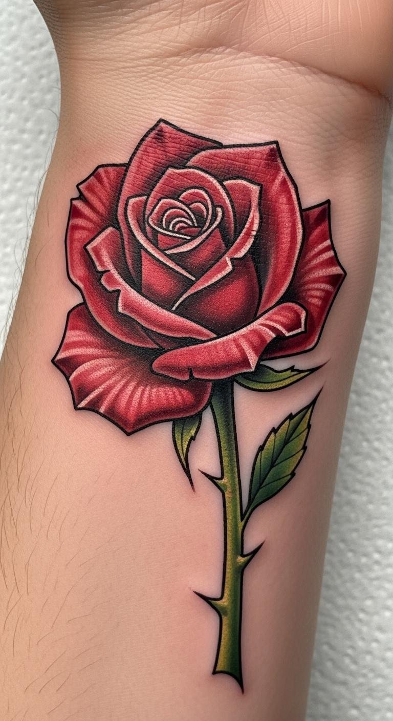 A red rose on the wrist says love at first glance. This design pops with bold color and simple lines. Get one for under $100 at a local shop. Sketch it yourself first with a marker on paper. Pick a spot that shows off your style without hassle. Colors fade less here, so it lasts. Try a DIY version with henna for practice. Keep it small for quick sessions. Artists often have deals for first-timers. Add a thorn for edge. This spot hides under sleeves for work. Go with a friend to make it fun. You’ll love the daily reminder. Focus on what matters to you. Make it your own twist.