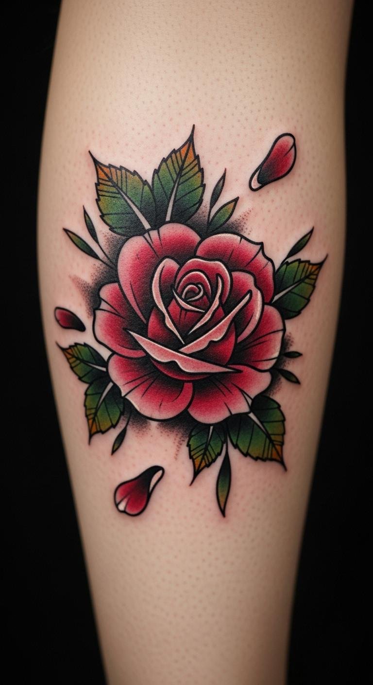 A neo-traditional rose on the calf updates classic vibes. Shading gives it depth and story. Aim for $150 total. Trace old styles on leg. Choose for active wear visibility. Outlines hold strong. Look for themed events. Add banners for text. Heal with store-bought aids. Practice with marker art. This spot flexes with movement. Keep visits efficient. Discuss with artists. Make it your update.