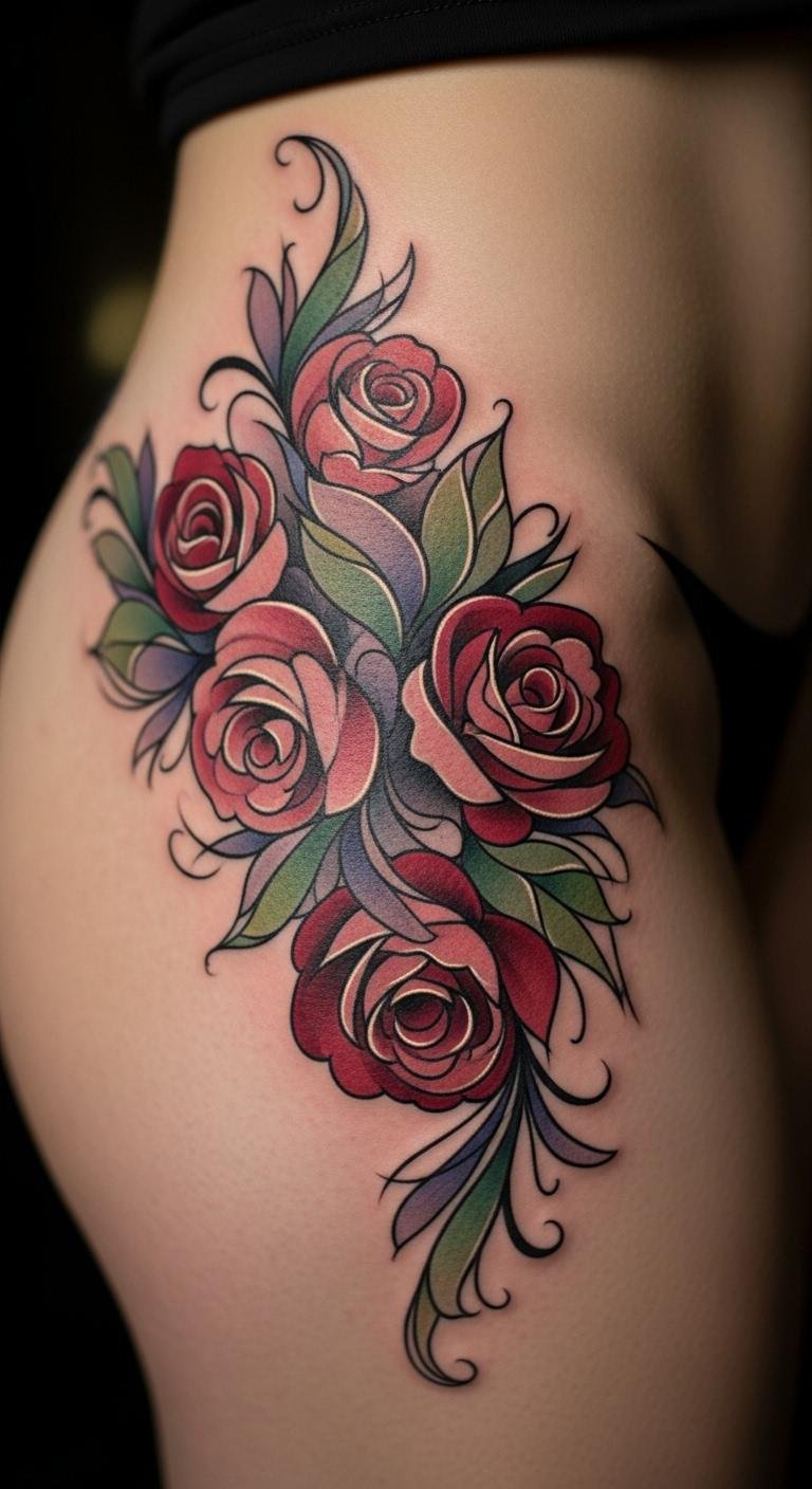 An abstract rose cluster on the hip offers free-form beauty. Swirls create a dreamy scene. Cost around $130. Experiment with abstract drawings. Place for personal access. Colors mix uniquely. Search budget-friendly options. Include dots for texture. Use simple creams. Try paint splatters at home. This design adapts to curves. Plan short stints. Get friends’ views. Make it fluid art.