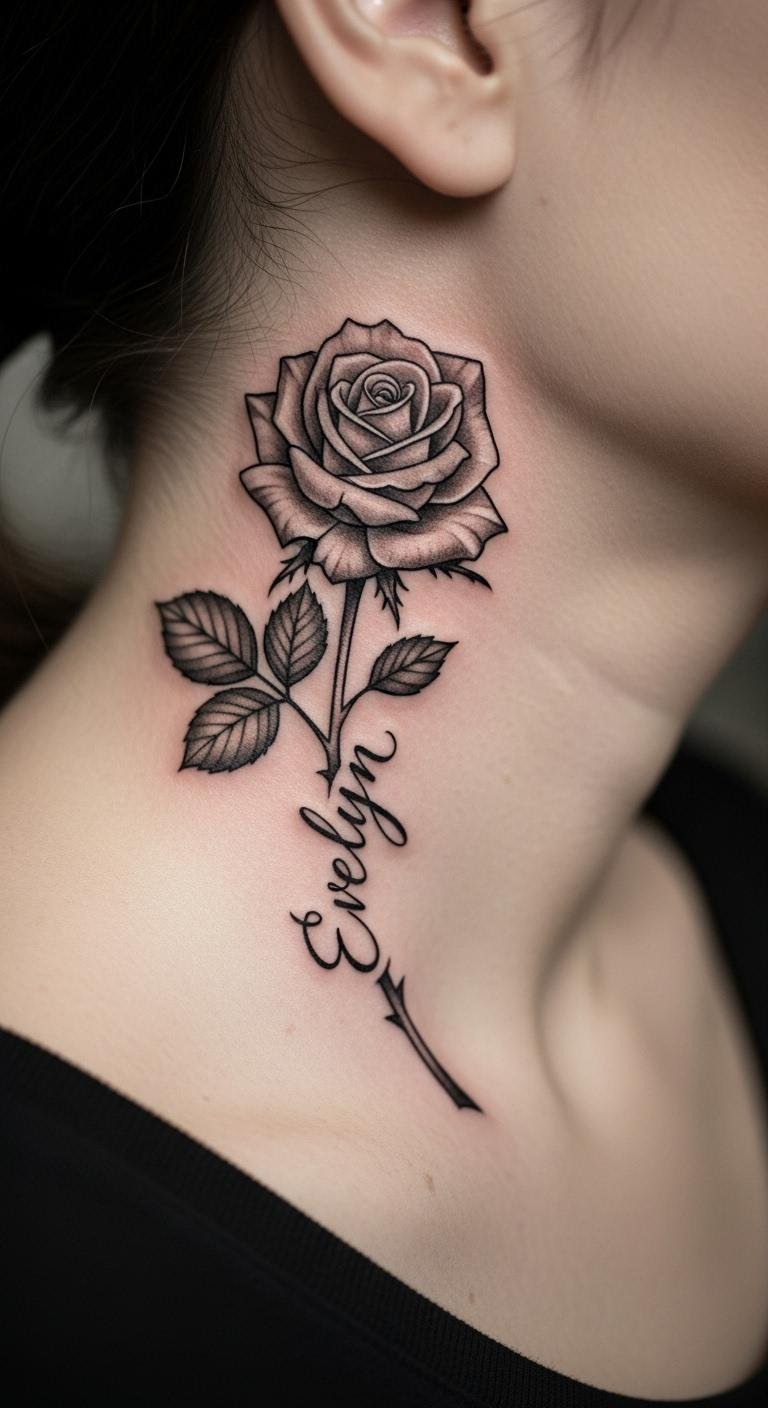 A memorial rose with name on the neck honors loved ones. Script adds a heartfelt note. Go for $90 simply. Write names on paper first. Put it for meaningful display. Letters integrate smoothly. Find personal touch artists. Add dates if needed. Care with gentle routines. Practice with temporary ink. This spot shows intent. One session works. Share memories. Make it tribute art.